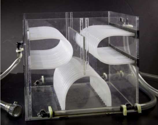 "Looks like there are 3 hoses. There is a semi-myth that hypo is heavier than water (true) but it dissolves in water thus, in solution and not really heavier. If the designer thought this was true then I would guess the bottom 4 drains would be for exiting the wash water or just draining the washer at the end of a wash. The bottom tube has a pinch valve again suggesting it is a drain. It would appear that the washer needs to be used in a sink so that overflowing water can spill over the top. Anyway trying to figure out someone's design is fun."