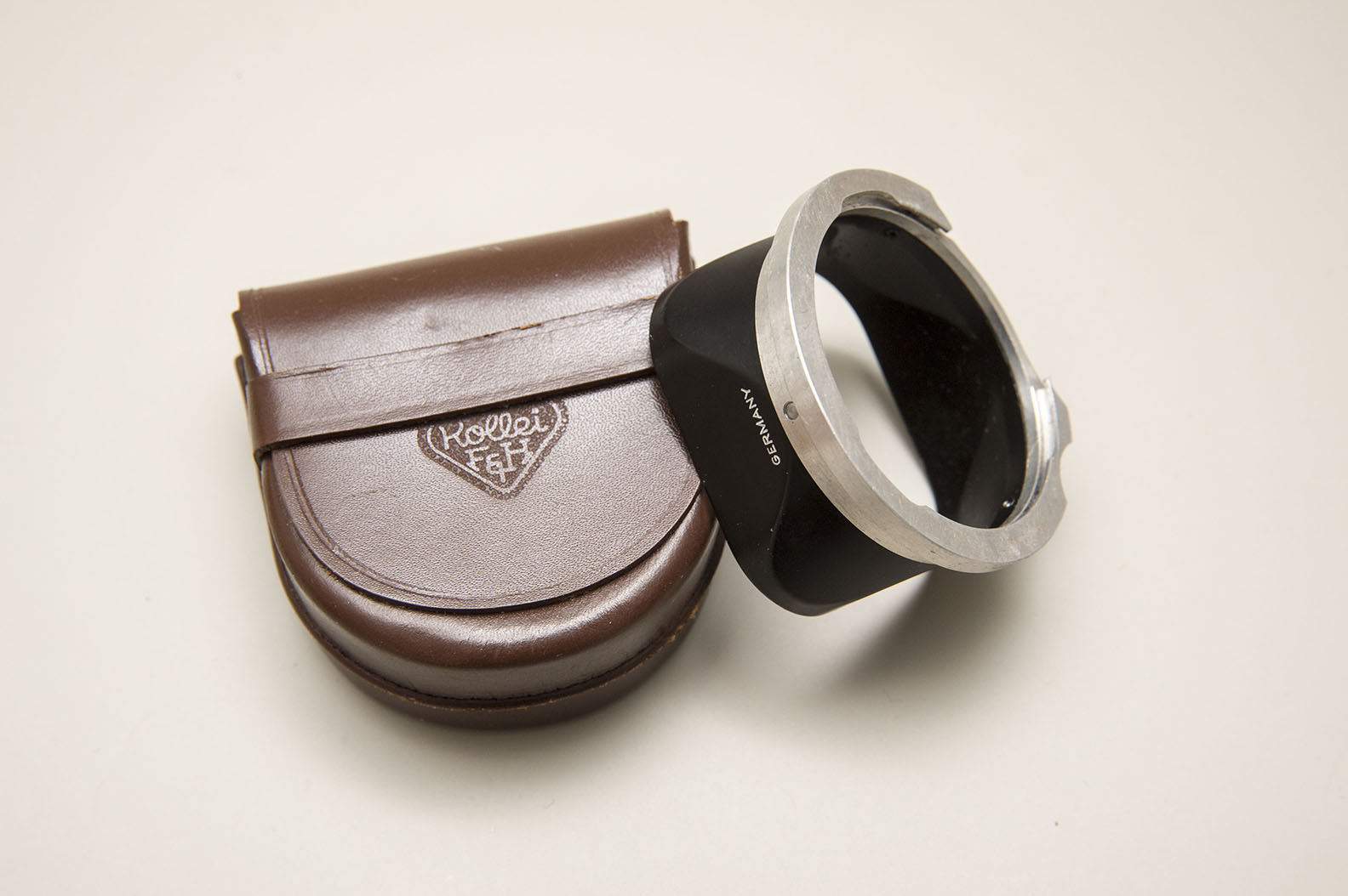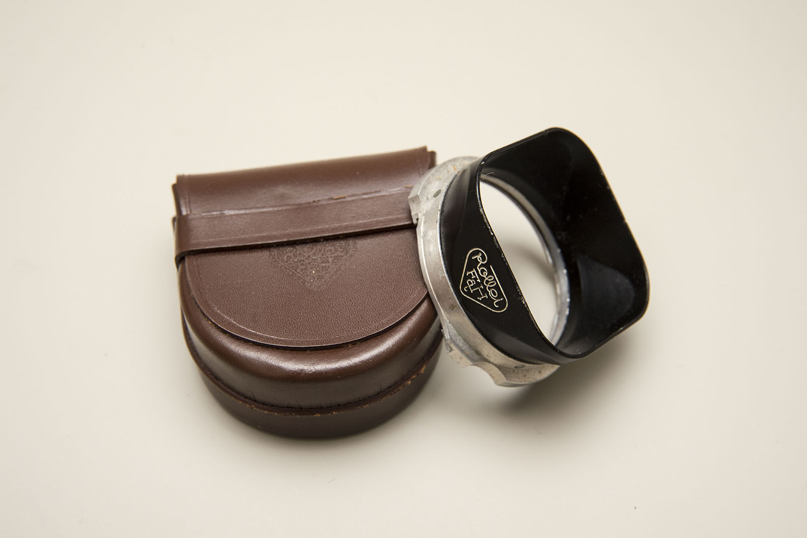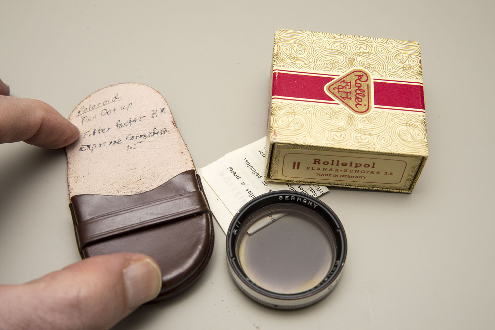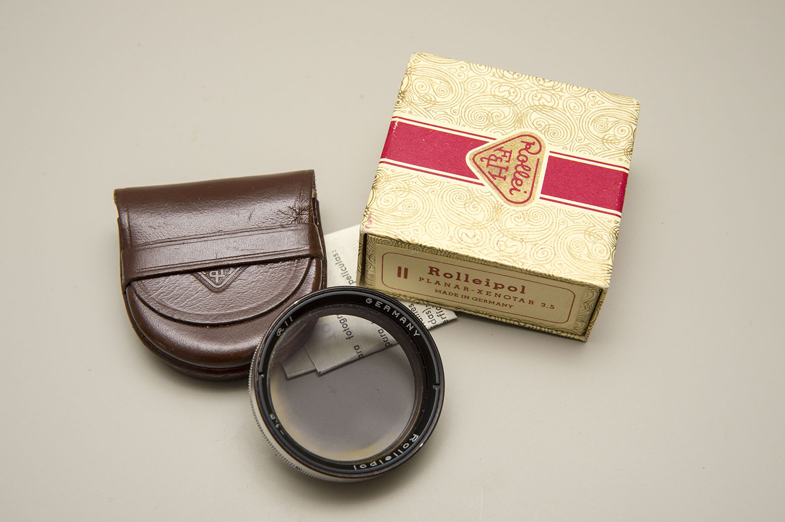 Rolleipol (the outer circular edge of filter is a bit faded) with leather case ((case has writing on inner lid - see photo)) $15