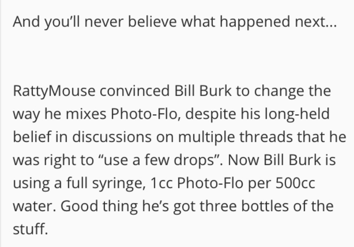Bill, in case your sarcasm is aimed at me (because I mentioned 0.5 in 500ml in post #34), I have to point out that I use the now-discontinued Mirasol rather than Photoflo, and the recommended dose is 1:400. But anyway, I do what works for me, and so should you. The point under discussion above was how do you measure small amounts, if you want a more precise measure than ‘a few drops’.