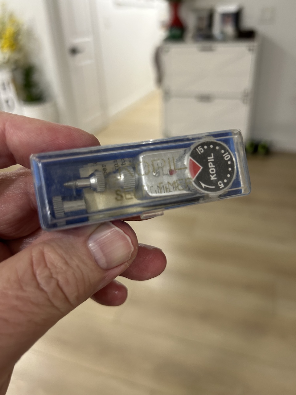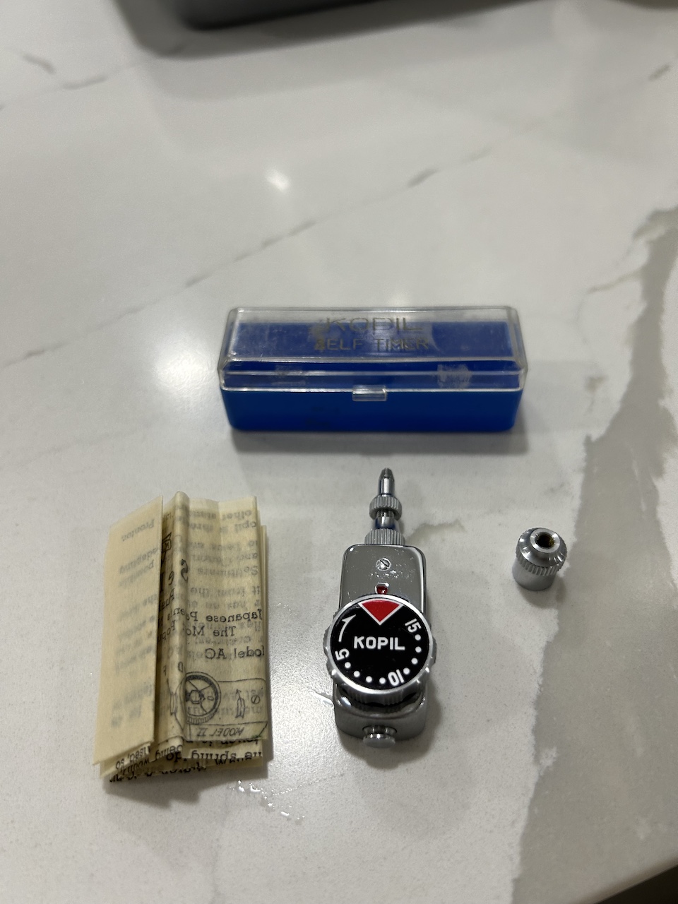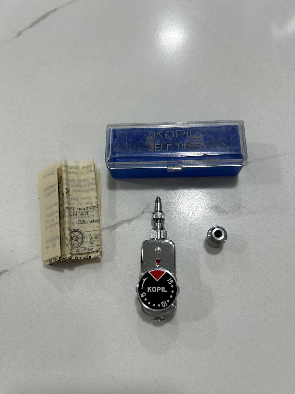 Kopil II Self Timer *SOLD* - Appears to be new, but the case shows some wear. The original instructions are included as is an adapter nipple for use on cameras that predated the current standard shutter release thread standard (such as the Nikon F and many others). The instructions are comprehensive and I suggest you read them before use as adjustsments for every camera are required. Works well however and looks so cool! Price: $18 plus shipping