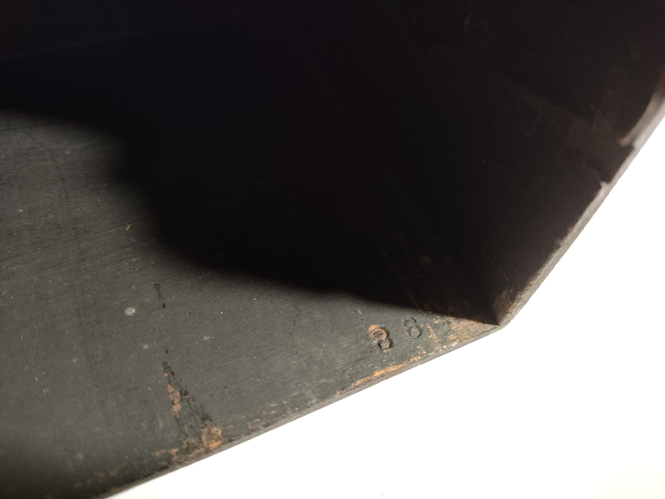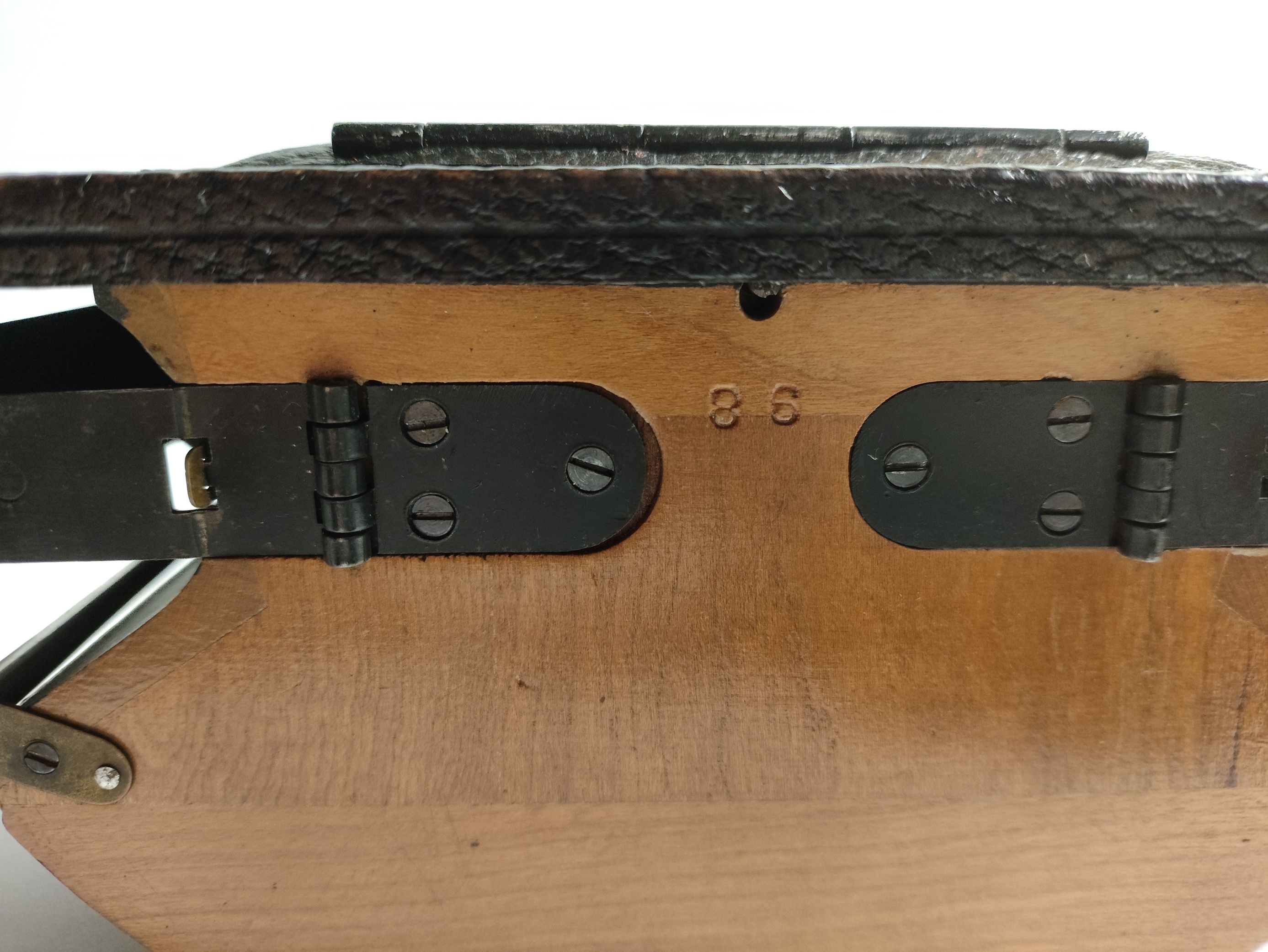 The serial number “86” is stamped into the underside of the wood near the rear hinges (see attached photos).