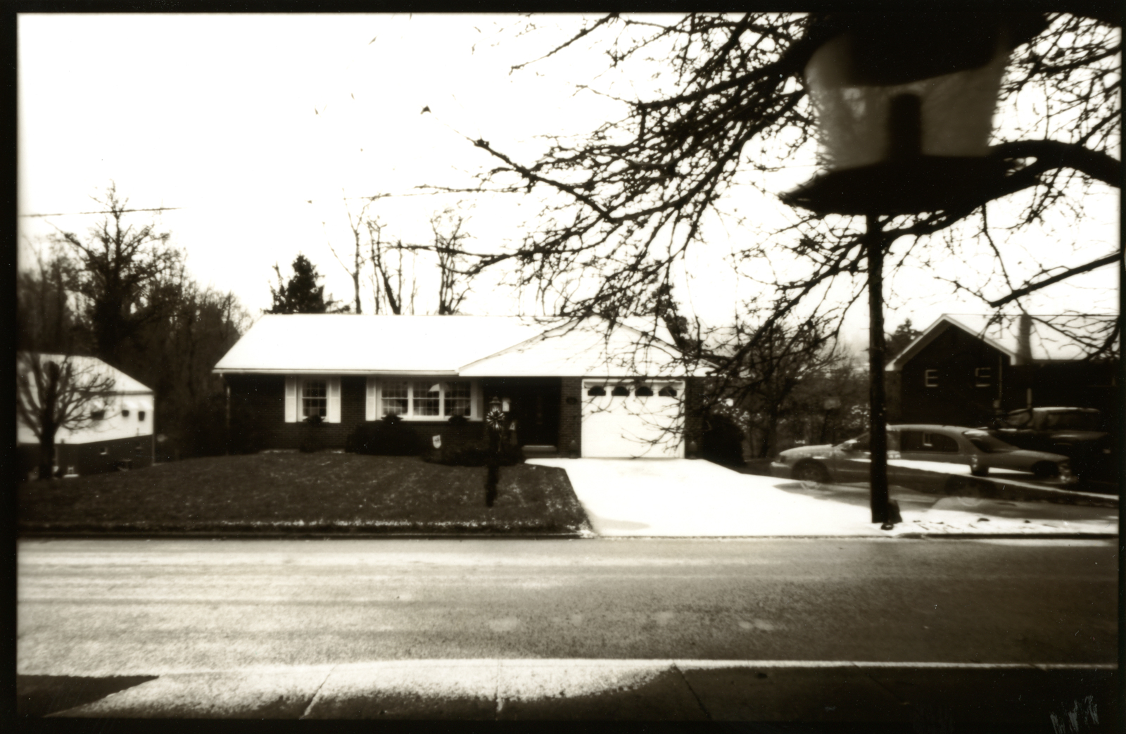 I set the camera on the rail of my front porch, it was snowing. The exposure was 28 minutes, the picture is of my neighbor's house. I got the black border by trimming the paper neg down a bit on two sides and allowing the edge to go black.