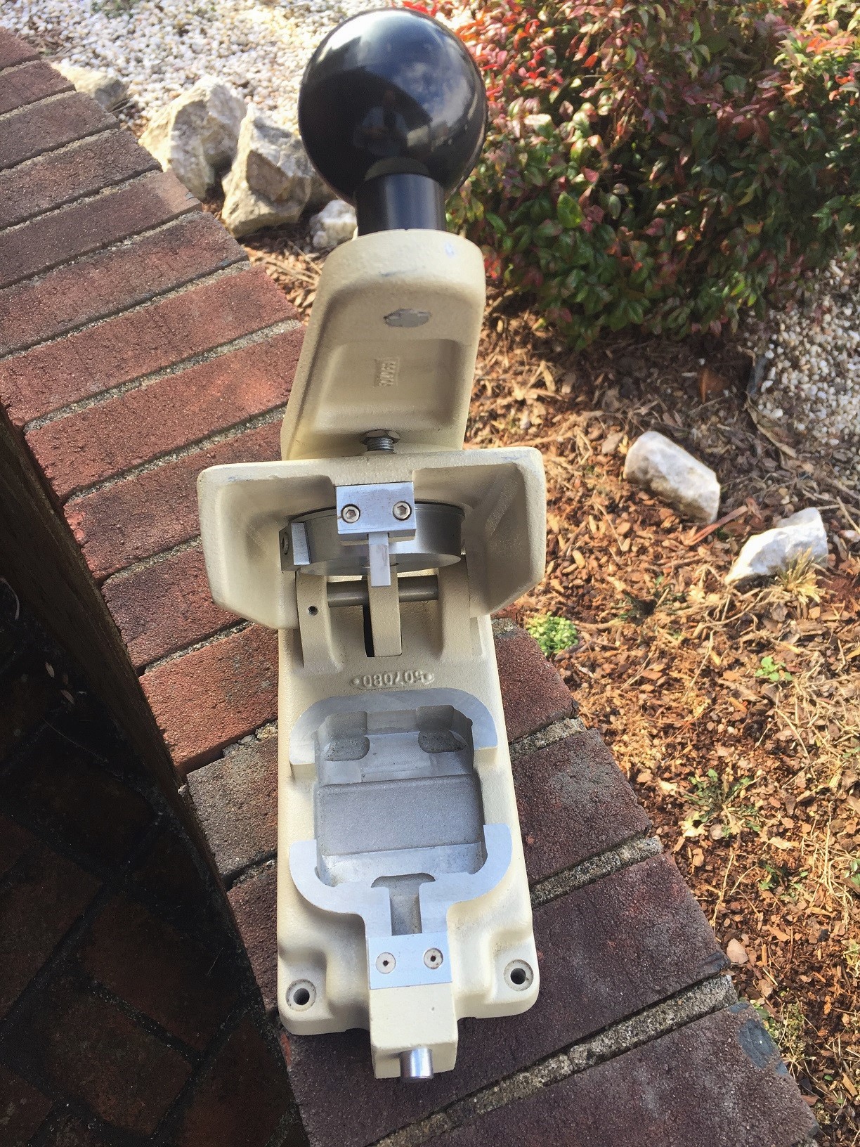 This machine, which is about 10 lbs of cast aluminum, has a razor sharp blade on a circular bit under the cover. Place the Super 8mm cartridge in the aperture, close the lid, give it one revolution on the handle and you have a perfectly cut circle in the side of the cartridge to gently extract your film!