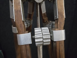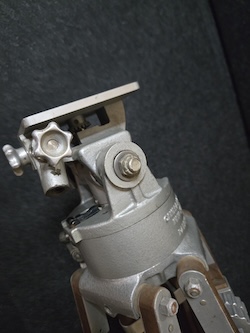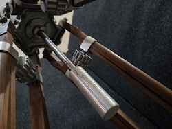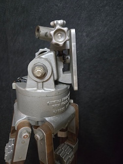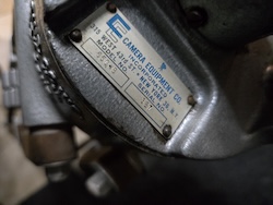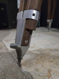Vintage Camera Equipment Company Model 650-B wooden tripod. Used in studios and in the field these were designed for 16 and 35mm cine cameras. They were also used by the army during WWII for shooting live action footage. A canvas strap near the bottom holds the tripod strapped up tight either for storage or travel. When the legs are all pulled in it stands about 45 inches tall and weights almost 20 pounds.