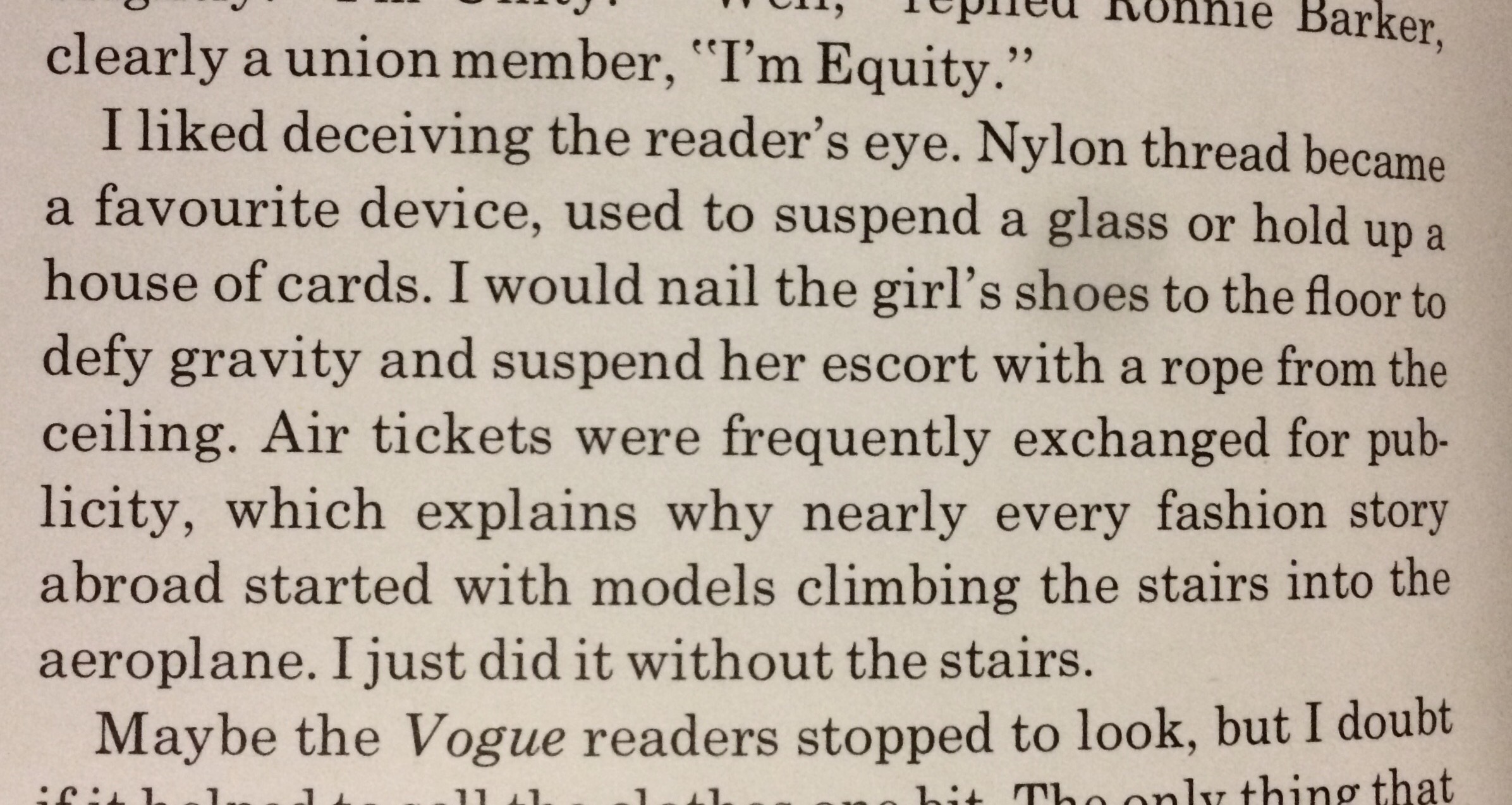 View attachment 240283 View attachment 240284 Have had a pleasurable time looking through the book I mentioned earlier for the first rime in a few years. (Personal View by Snowdon. Published in 1979. Looking at adebooks.com it is available for a good price. And also in German too!) I'll attach a couple of bad snaps of the book. Not sure if it's the same shoot as CMoore posted as possibly different models, but is for Vogue from 1959 and the text confirms shoes nailed to the floor and ropes suspended from the ceiling. Of course, it would be part of the process to then use a retoucher to finish off the prints before going to press. In the credits for the book, Snowdon acknowledges three different retouchers he had used up to 1979. Always good when a photographer credits everyone who has worked on a shoot!
