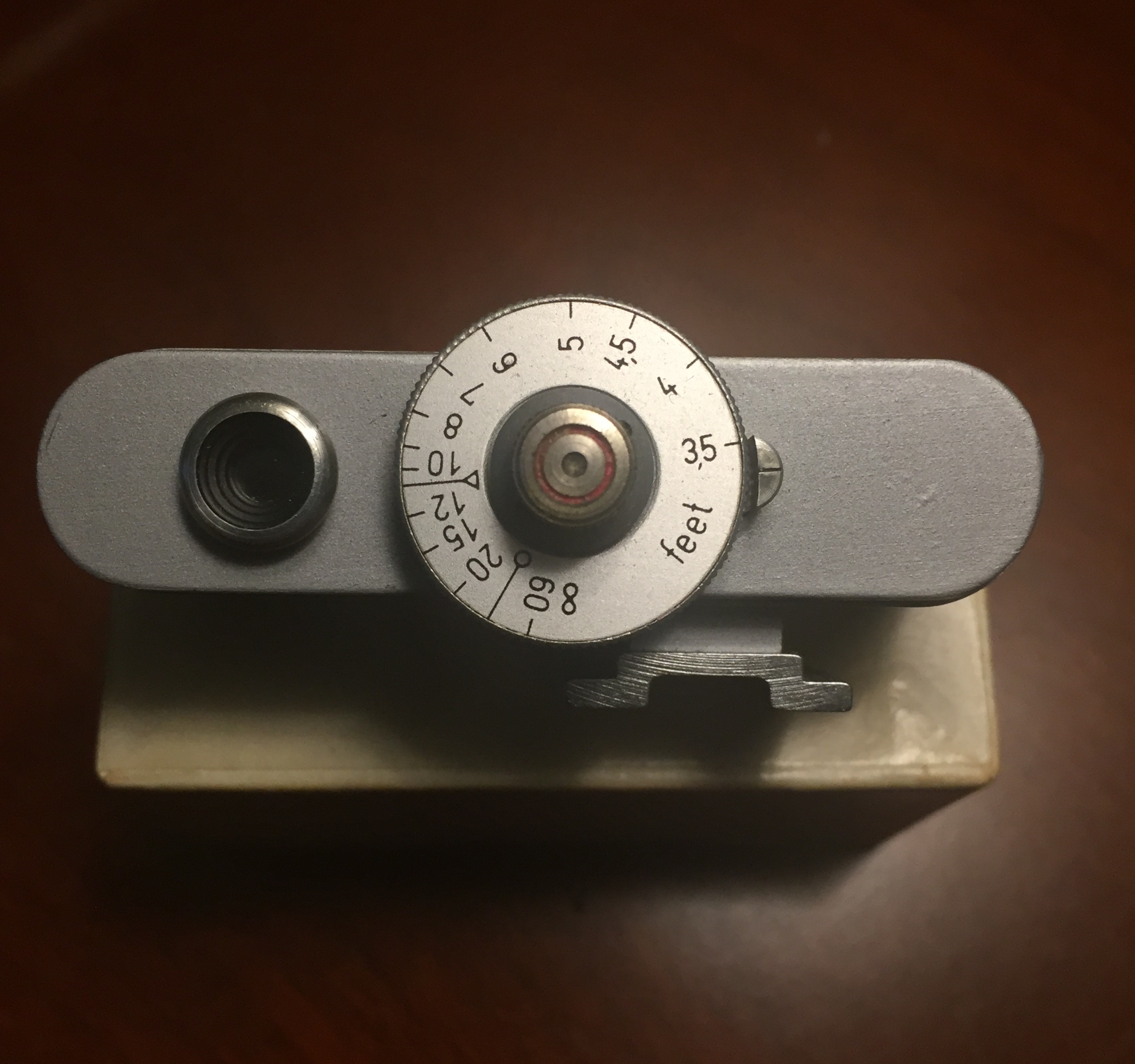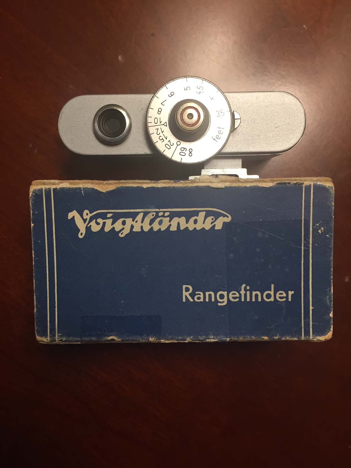 Voightlander rangefinder 93/184, shoe mount, with what seems to be original box. Distance scale seems to be accurate (in feet). Patch is good. Cosmetic condition is good.