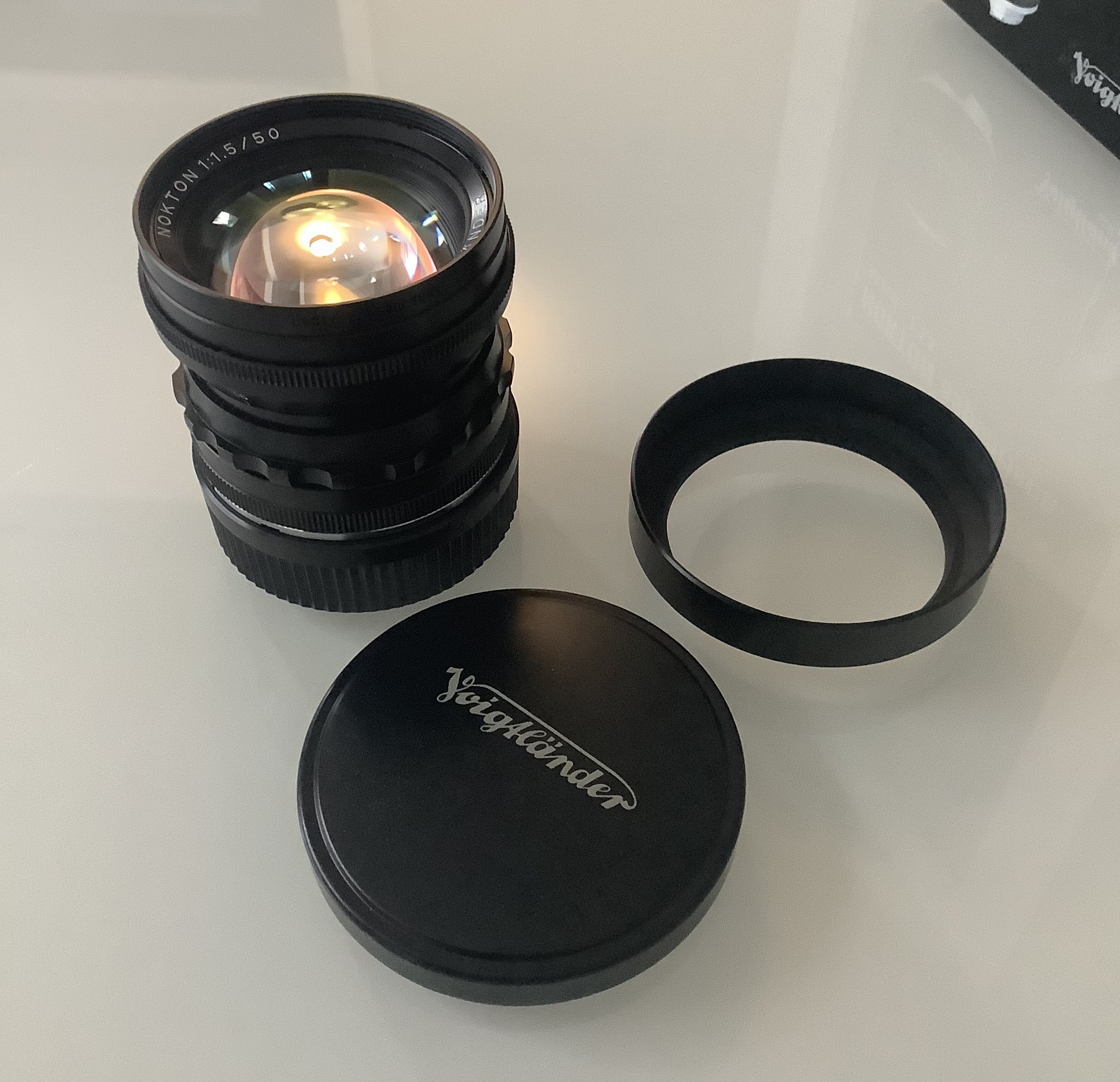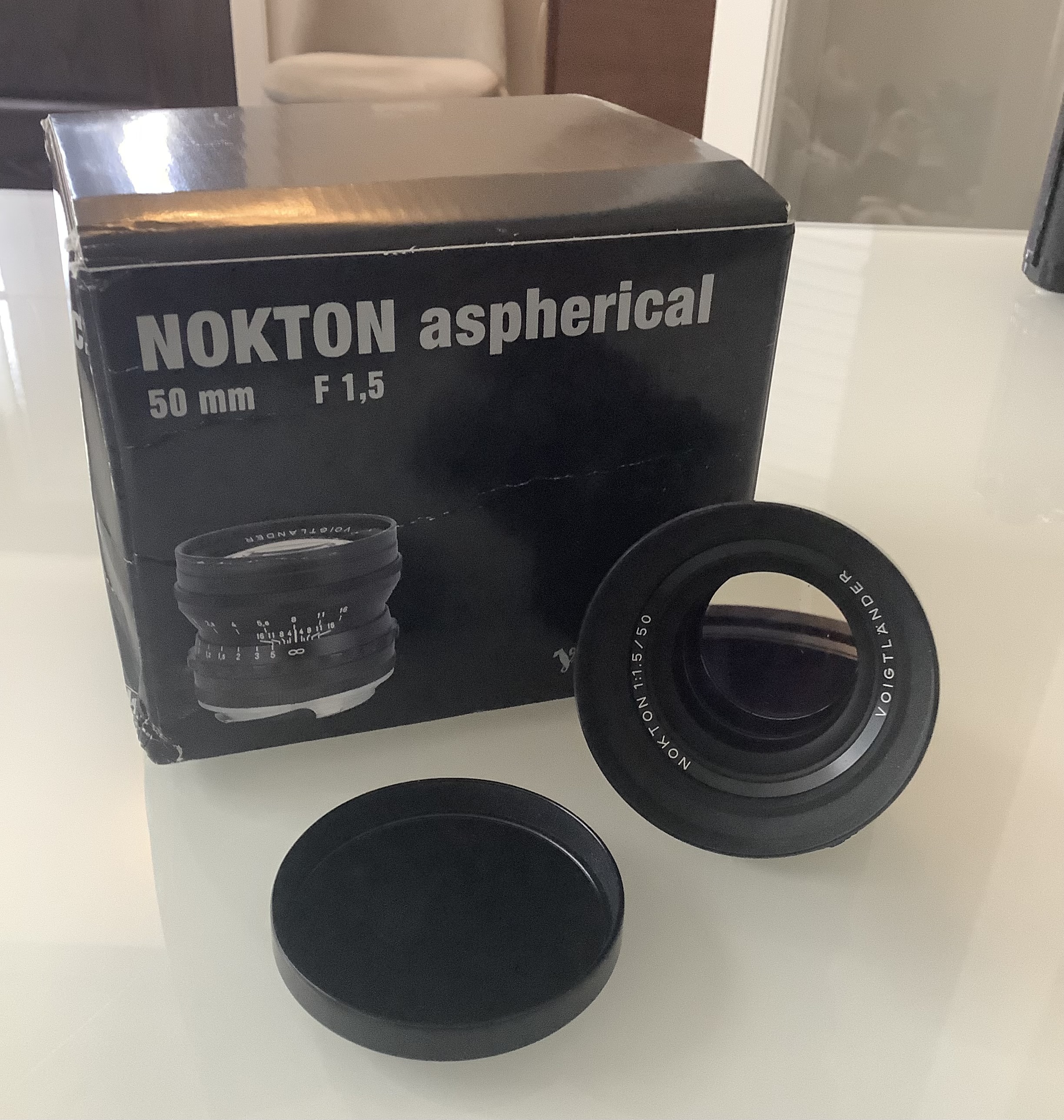 Selling a used Voigtlander Nokton 50mm f/1.5 Aspherical lens. This lens is in like-new condition and comes with its original box, lens hood, and caps. It's perfect for photographers seeking a fast, versatile prime lens.