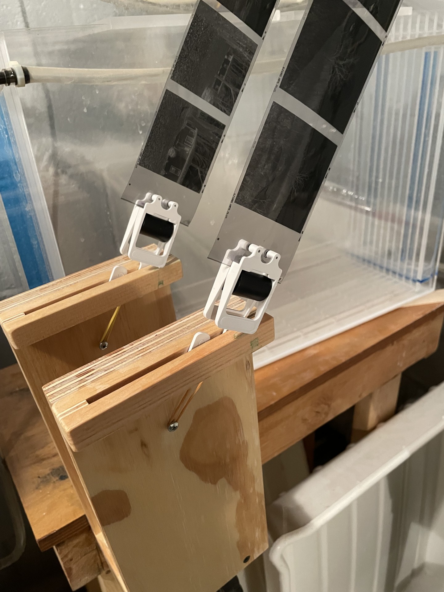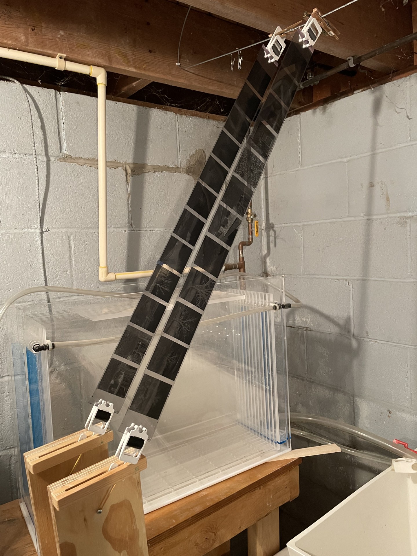 And here are two pictures of how I hang my film at an angle. This is 120 obviously, with 35mm I put the wood block onto the floor and get it at as much of angle as I can. I'm in the process of trying to fabricate something to hold 35mm at a stronger angle.