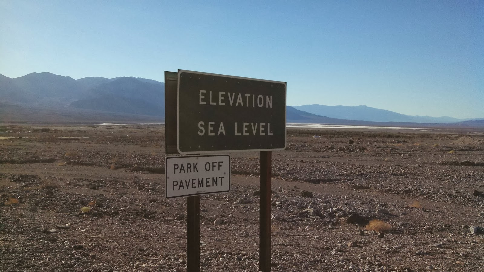 Driving into the monument is dramatic as one keeps descending into new valleys (the down-dropped basins) that just keep getting deeper and deeper. It's eerie to then stand at Badwater and look waaay up the side of the adjacent cliff to see the small sign that says "Sea Level". And there aren't too many places you can drive and see roadside signs like this one.