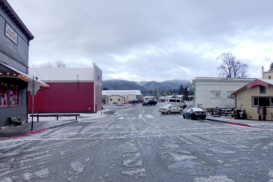 Last night at the town bar -- I live on the other side of it. Went in and listened to the last two songs of the night, had a pint of porter and then the town lost power for 3 or so hours. Slushy here too, this morning...the big red building is the local Grange -- I flipped pancakes for a couple hours there this morning for the monthly pancake breakfast. Blue Lake, CA is at about 80 feet elevation and 300 miles north of San Francisco.