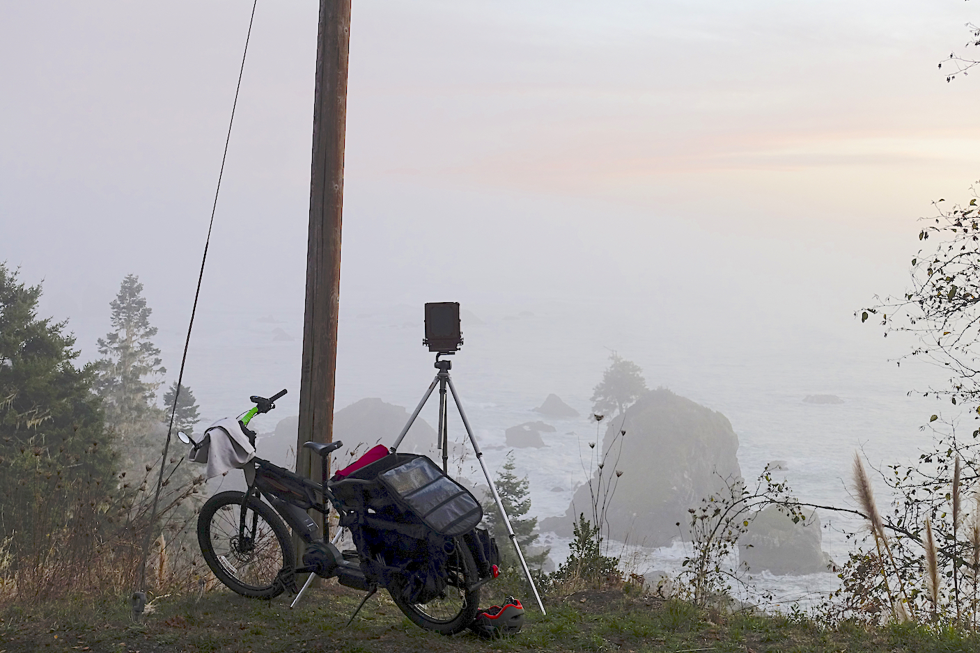 Rode the bike west to the ocean and headed north. Beautiful day...probably got up to almost 60F. Accidentily attached my 5x7 camera pack to the back of the bike in such a way I did not have to take it off the bike to access everything. Wish I could be that smart on purpose. Watched it get dark while sitting above the ocean then had a ride in thick fog until I headed inland again and home. About a 45 mile day...noon to 7:30pm.