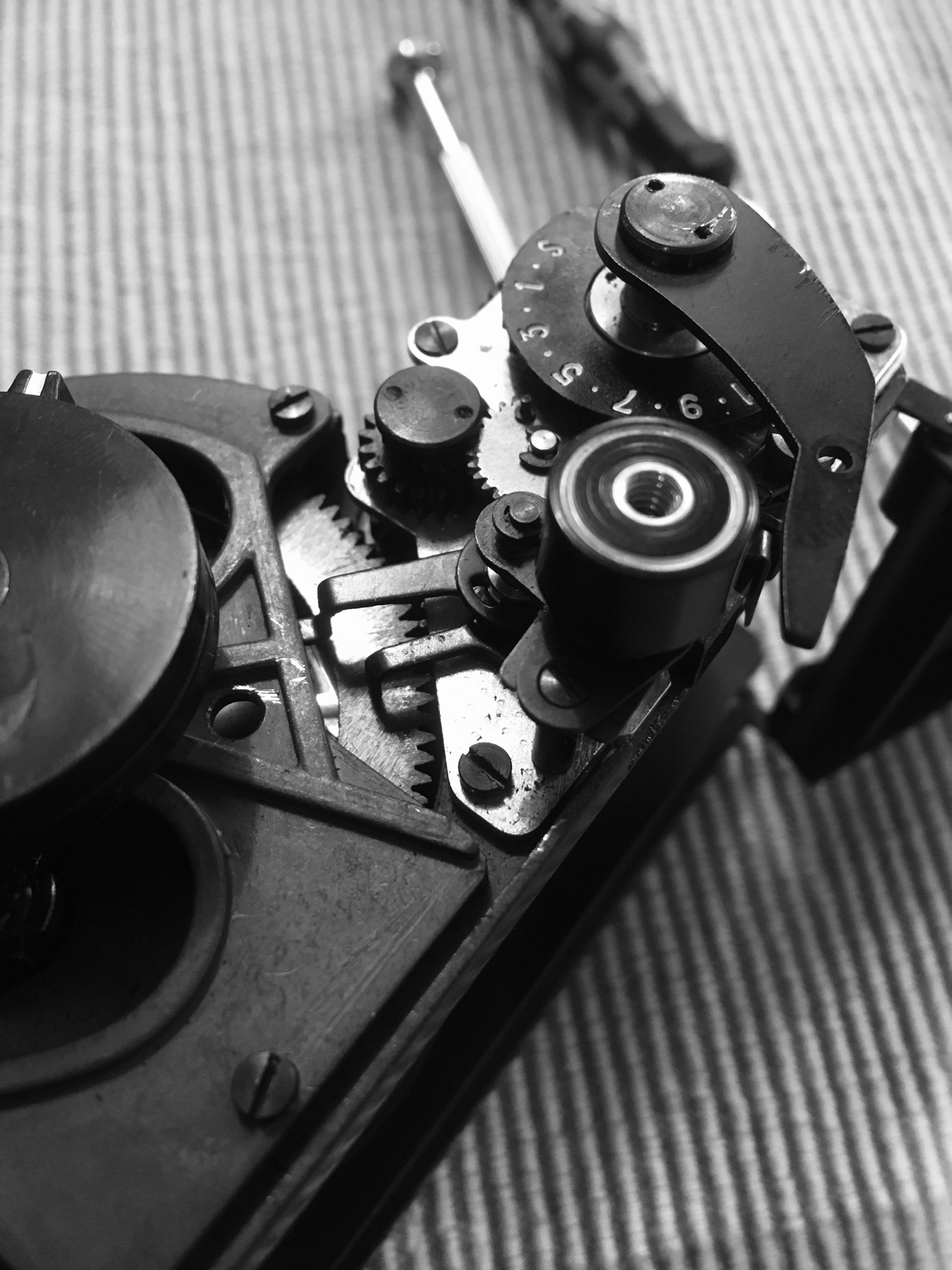 Today I pulled the top plate off the Minolta X-9, just to figure out how. I was prompted to do this by some intermittent slowness of the shutter button. I only took the top of the button off and didn't dig any deeper, but the activity seems to have sorted out whatever dust or tarnish was preventing it from working reliably, because it's much better now.