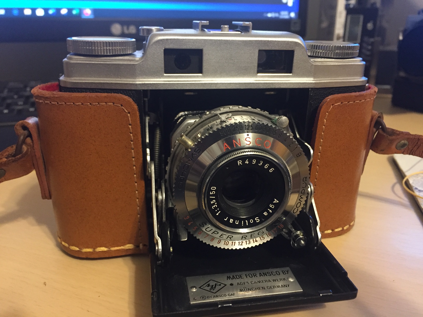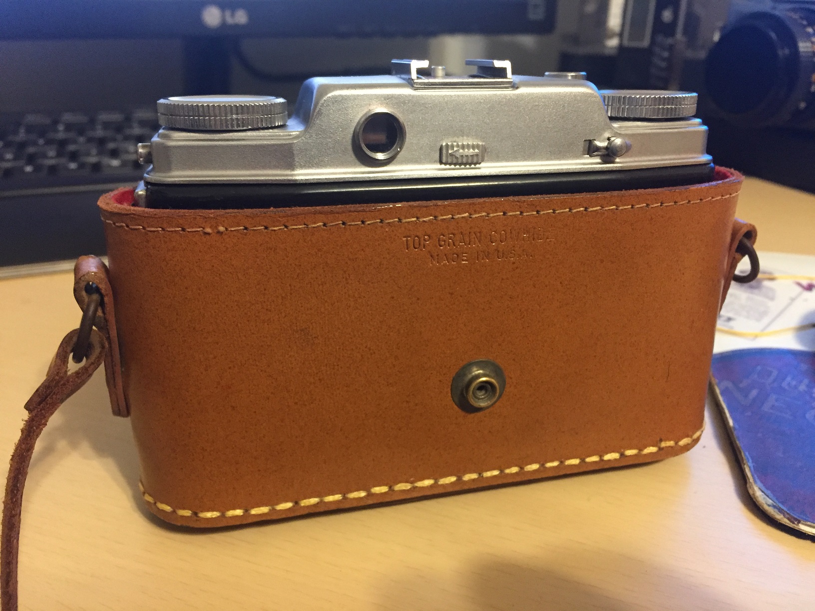 Restitched the bottom to the leather case of my Ansco Super Regent. Now I know why the lining is red; to hide the blood...