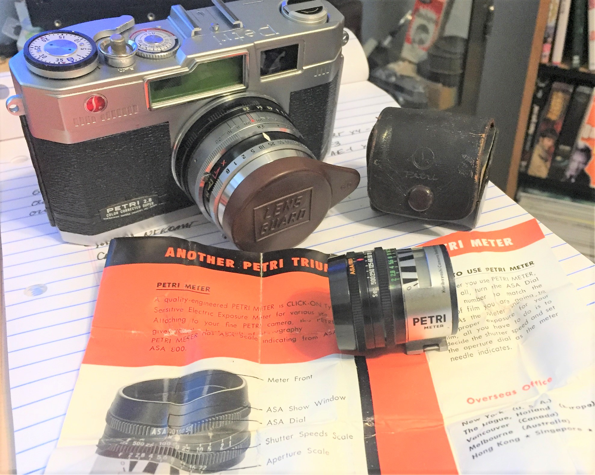 Got a non-functional Petri clip-on light meter for my Petri display and managed to get it working again by dismantling it and putting the movement back into the pivot point. The meter now deflects, but I am sure it is not accurate, but I don't really care as it is for display, as is the Petri Color Correct Super 2.8 that it will reside upon. The rangefinder has a detached film advance and heavy deposits on the rear element, but I have several other functioning Petri Color Correct Rangefinders of the same era, so I'll just let it look pretty in my display case...