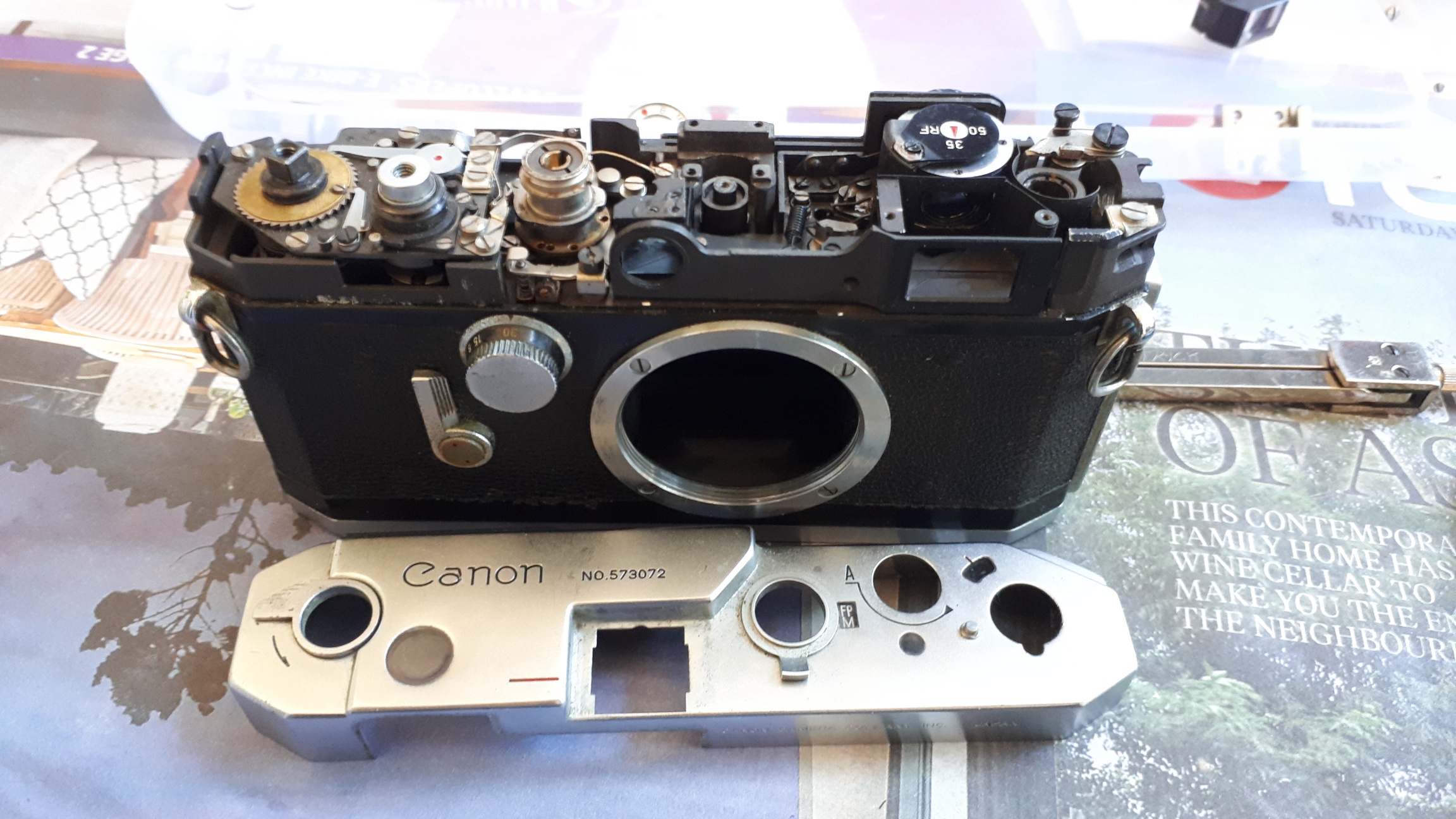 A grubby canon VL2 turned up today, so this afternoon I pulled the top plate off and gave the optics a clean. There's a bit of tarnish in the prisms that I cant get to but the other windows are now clean and its quite usable again. All the shutter speeds are firing and sound correct, timer sounds a little tied, but is getting better with a few goes.