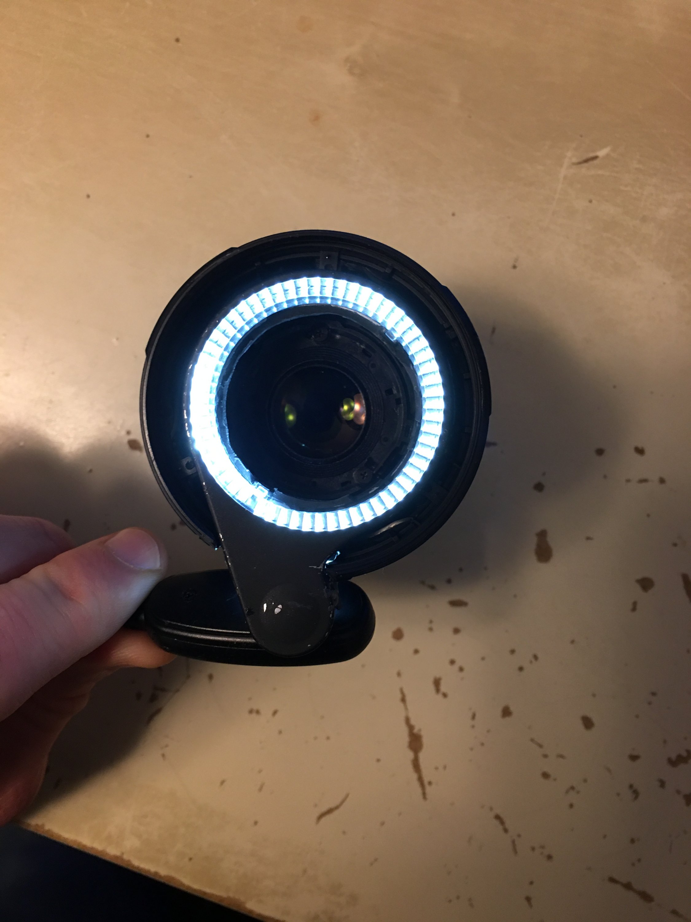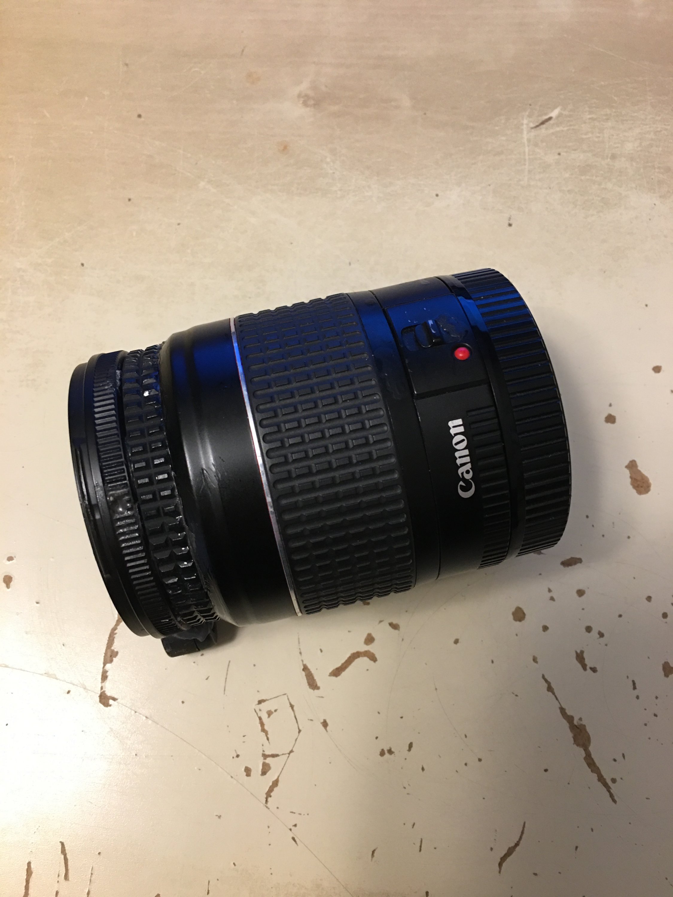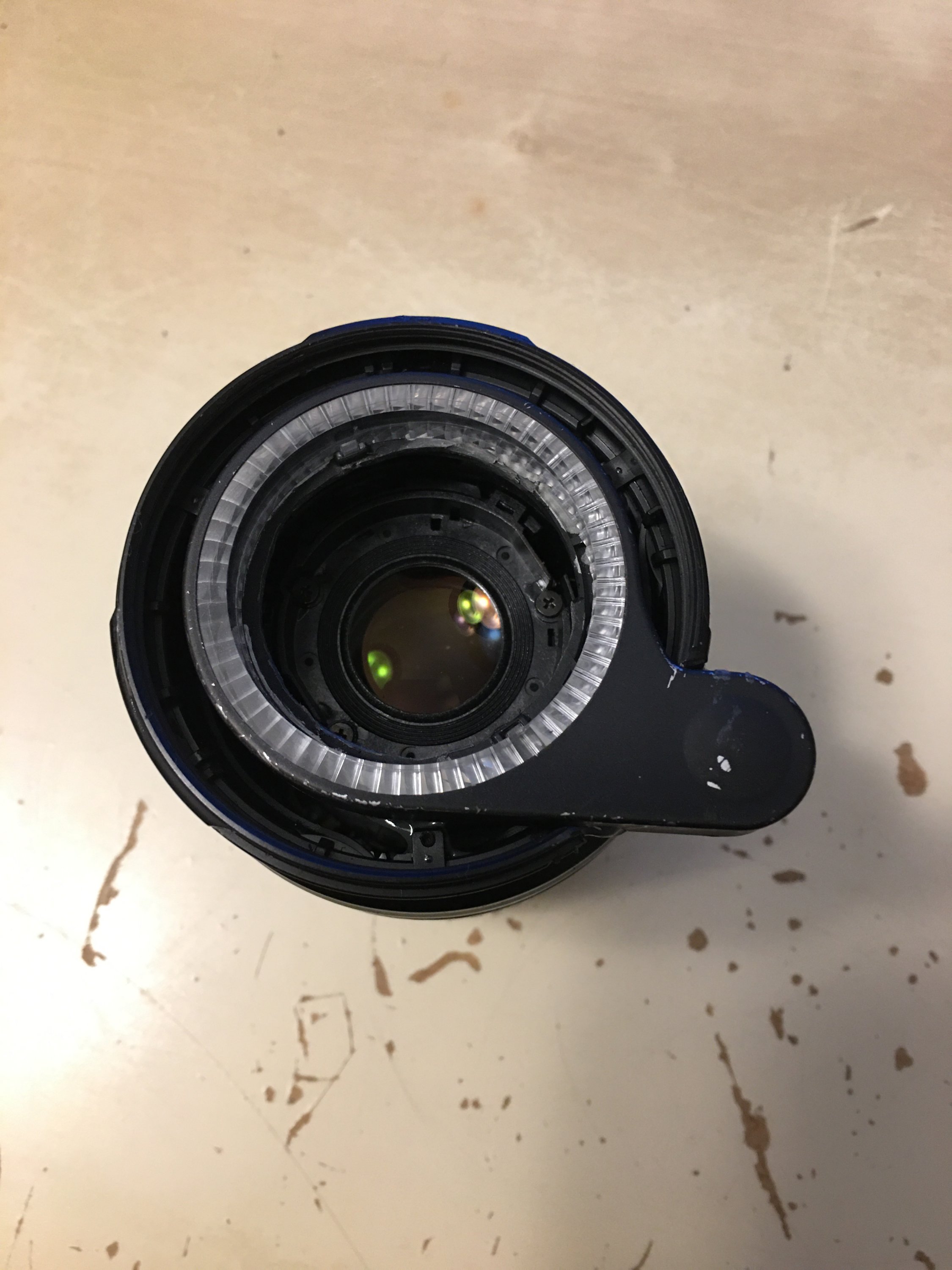 Here are pictures of a Canon 28-80mm zoom with a bad focus motor. It came attached to an EOS Rebel body I found for $15 in a junk shop, I mean, an antique mall. I’ve converted it to a close-up lens, which gives magnification of roughly 1-2x on my EOS 1Ds Mk II. I’ve removed the front element group and cut the body of the lens down a bit to get a little more working distance. The aperture mechanism still works! Also, because the working distance is so short, I fitted it with a ringlight accessory from some random video camera. Waiting for a box of LED key-fob flashlights to arrive so I can attach a more permanent light source.