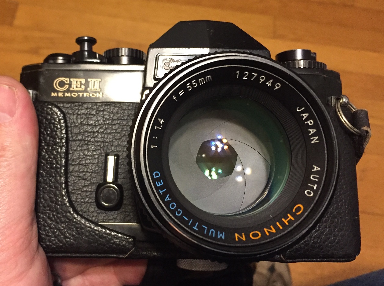 Chinon Memotron CE II; I was totally unaware of this very interesting camera until I found it today in a thrift store for $4.99 USD. At first, I debated if it was worth purchasing, as it was filthy and the aperture was fused open in the lens,but now I am very glad I did, as it is quite an interesting camera.