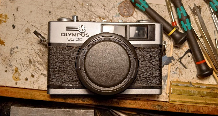 I had some fun tinkering with an Olympus 35RC so I picked up a cheap (broken) 35DC because I liked the lens on it. The VF/RF windows had been smashed, so I found an even cheaper more broken DC but with its top plate and windows intact to use as a salvage carcass. Turned out the damage extended to the interior VF lens, but fortunately my parts carcass had a good looking VF unit. On these cameras the VF/RF mechanisms are in a single block casting so, three screws unscrewed and it lifted right out. Did the swap without damaging any of the rat's nest of wires and put the replacement top on and it all works. The RF lateral alignment screw seems to be jammed and I don't really want to go in and remove that block again. But the hyperfocal distance on this thing is 15 feet, so eminently useable without using the rangefinder. I doubt that I'll shoot with it much, though--the main lesson learned is that I don't like a camera with no manual override. The RC is much more to my liking as a shooter.