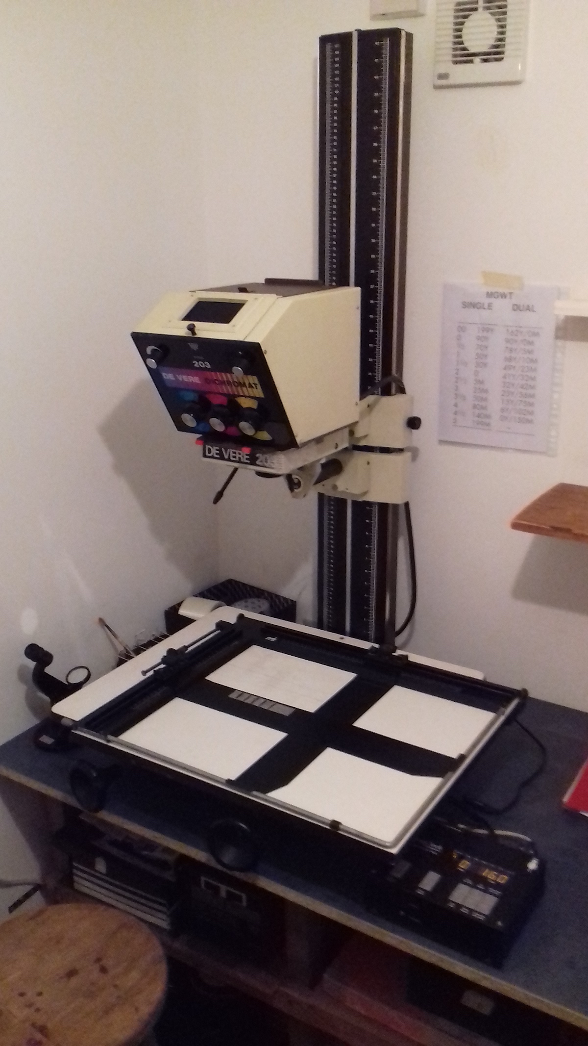 It suits me very well, I am not even slightly tempted to change. Despite being a budget model, it was really well designed by somebody. The body is robust, and the movements work flawlessly. I dispensed with the baseboard, to make it easier to move the easel around. The column is as rigid as aluminium sections can be, but I found it drooped at high magnifications under the weight of the head, causing poor alignment - I suspect that happens with a lot of enlarger designs, even with steel columns. Since I wanted to standardise on 16x12, I solved the problem by fastening the top of the column to the wall with a threaded stud; and subtly shimming one end of the negative carrier with a thickness of cornflake packet. The head can be rotated if you want to make prints larger than 20x16 on a nearby wall (never done that), or if you need to correct converging verticals (done that only once, worked a treat).