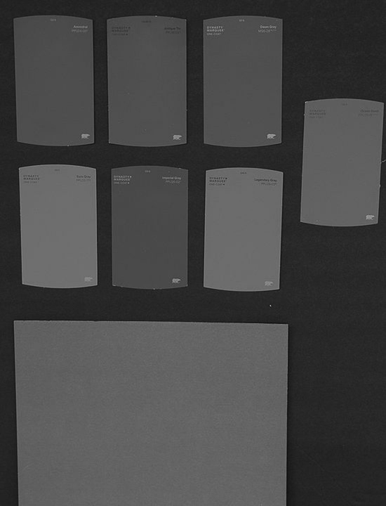 I happened to be in Home Depot and selected twelve swatches that looked like they would be close to my existing gray cards. All were Behr Dynasty Marquee line: dawn gray, imperial gray, dawn, gray, imperial gray, antique tin, ocean swell, euro gray, lengandry gray, and the Ancestral ppi-24-05. I was just doing this out of curiosity to see if any matched the gray cards I have been using for years I thought reading with spot meters under constant illumination at the same angle would be interesting and see if my light meters agreed with each other. And since the original post was looking for a cheap gray card it might be an answer. You might want to do it more scientifically and give us all a better answer