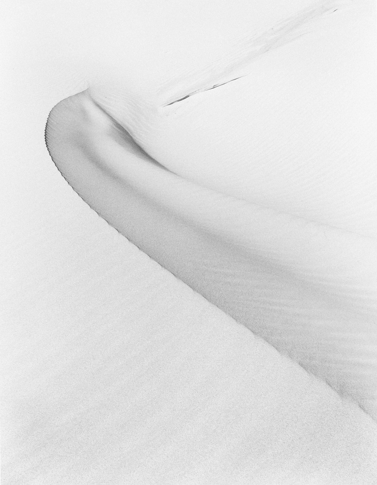 A fairly soft subject...blowing sand on top of a dune, about 700 feet above the valley floor. I'd call it a fairly strong composition, but that is subjective. (16x20 silver gelatin from 4x5). And for fun (and hopefully what others might consider a strong composition, is a 4x5 contact print taken the same day, with the other photo taken at the top of the dune seen in the back. This photo was taken purely in fun, but I like it.