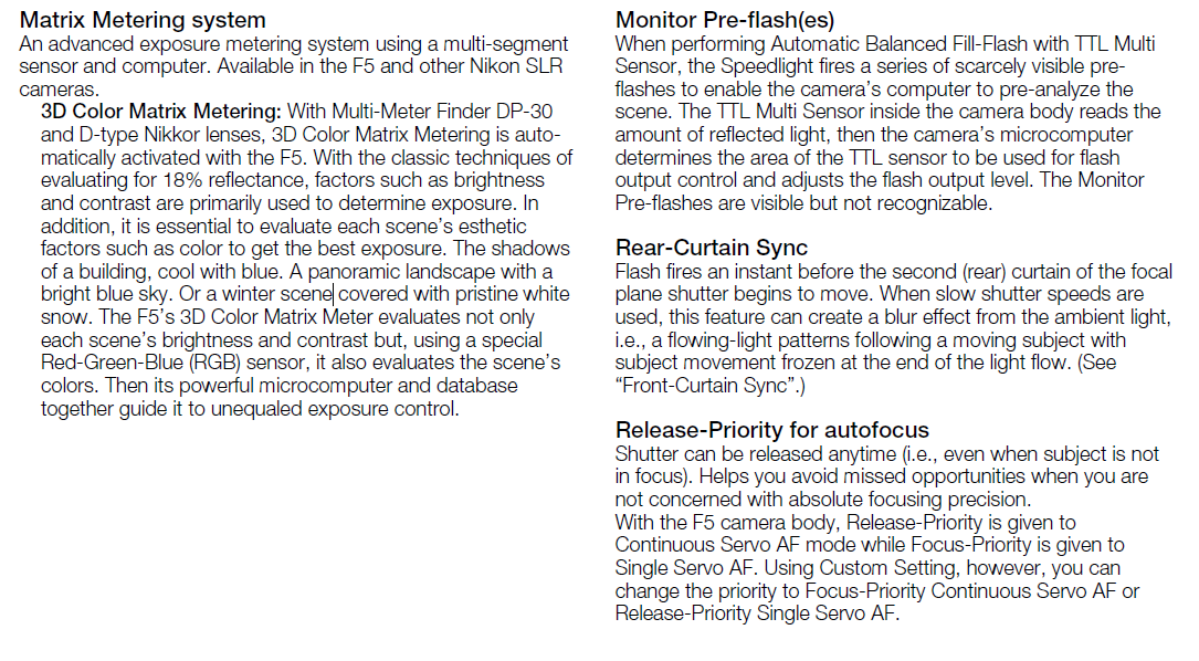 Unless you need to lock focus on a red Formula 1 car and accurately meter it under changing light conditions as you pan with it, the F5's meter provides no significant advantages over most other meters - especially not handheld incident and spot meters - which also have the advantage of giving you a clear idea what you metered from. To read some of the stuff above, you'd think that fast, accurate metering was impossible before Nikon put matrix metering in a camera! This may be a shock to some people, but you can accurately meter a scene with one (at most two) readings with either an appropriately indexed spot meter (ie one with the IRE scale) or an incident meter & a suitable shadow in a matter of seconds - even if the light is changing. All the Nikon F5 is doing is attempting to automate this at a very high speed for specific applications. I think some people would be better off learning how to actually use a handheld meter, then they'd have an easier time understanding scene contrast.