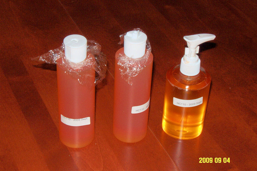 First, I transfer the HC110 to smaller bottles with caps that permit pouring small quantities, or a pump bottle (see photos below).
