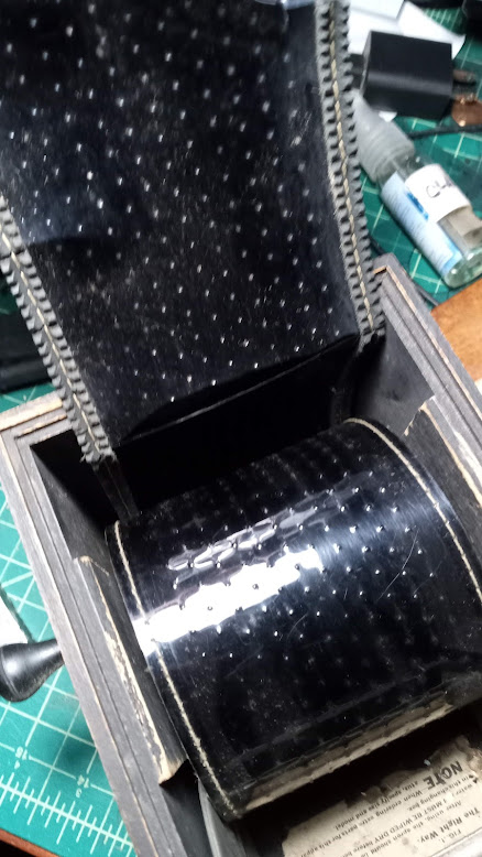 Here's a look at the back side of that apron. You can clearly see that thick ribber piece sewn to the apron itself. Apparently it created enough space to allow the developer to flow freely and in even contact with the emulsion. I used to think those little dimples were pinholes to circulate the dev, but they aren't. I guess they just discourage the film from sticking to the apron. My apron is very old and brittle--it's got several cracks in it, so I've never used the tanks except as decoration. One tank, though, is labelled for pack film and has a rack that puts the film sheets in a taco-style configuration. That one might be useable.