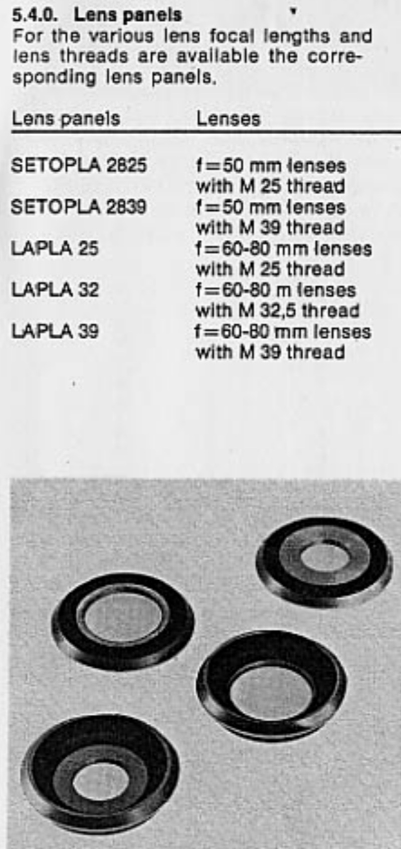A flat lens panel (12) is supplied with the Durst M 305 to take 50 mm lenses with M39×26 tpi screw thread.