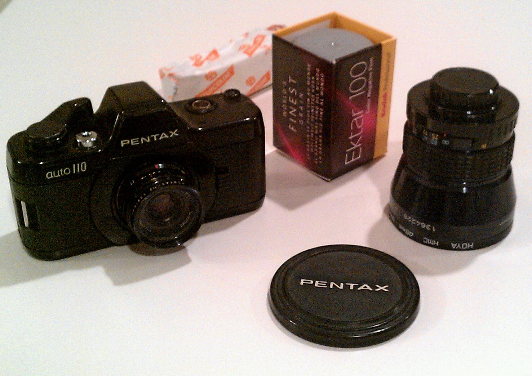 Pentax shown with normal 24/2.8 lens. Ektar box for 35mm shown for size comparison.