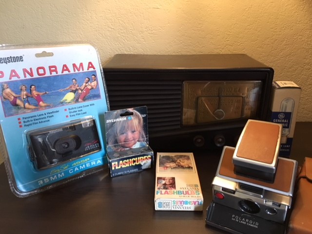 I got all this loot from a thrift store and a garage sale over the weekend. The SX-70 with a case was $13, it needs the battery contacts cleaned. The panorama camera was $3, the flash bulbs were a few dollars and the DDB projector bulb was $5. The Philco radio was $25, it cleaned up really nice and it still works.