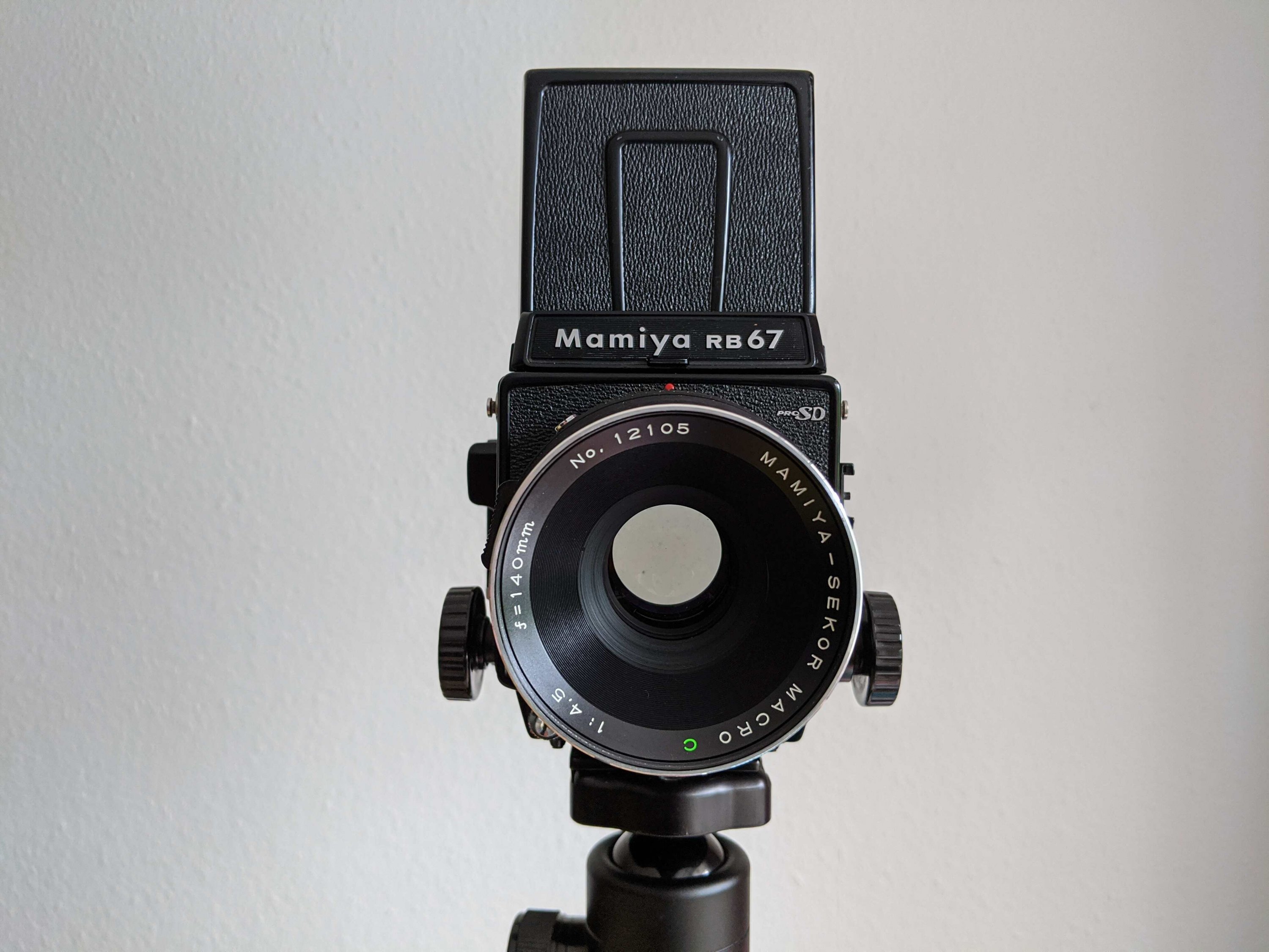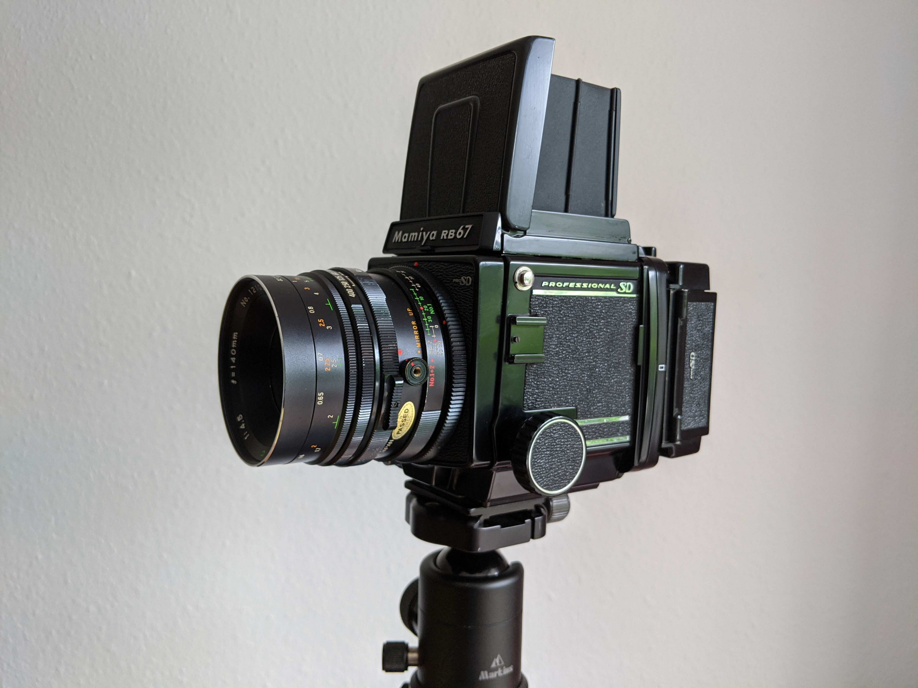 It took some time, to get all parts together, but now my latest camera purchase, a Mamiya RB67 Professional SD, is complete so far as I have a functional camera. I bought it as broken, because the seller wasn't sure what or how to test the functionality and it turned out that the 50mm lens indeed had some issues. But I found a nice 140mm macro lens and replaced the Pro S film back by a newer SD version, replaced the focus screen, because it was a grid one, and the viewfinder, because it was bend and moved around a lot.