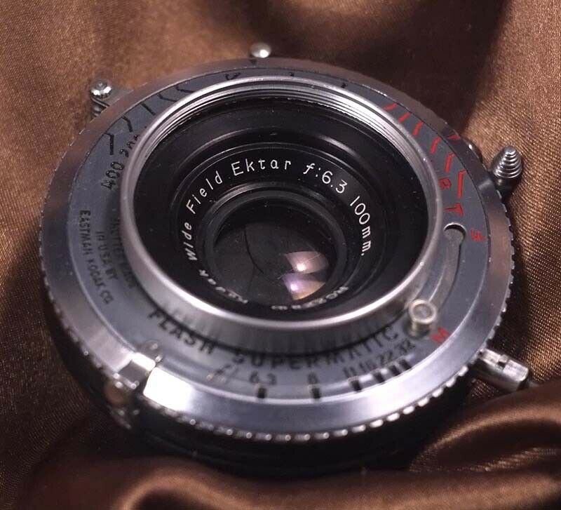 Ran into this gem on eBay - 100 mm f/6.3 Wide Field Ektar, set in Graphex Shutter, manufactured in 1953. Lens is spotless, not even any dust, and shutter timing compares closely with my 135mm Graphic Optar set in the same type shutter (It was recently CLA'd). Aperture settings are crisp, but no sticking. I got this one for less than half the price of some others. This one will work nicely on my Meridian 4x5 Model B, and my Super Speed Graphic. I used to own one of these, and got some great photos with it; unfortunately let it and a Commercial Ektar 8.5" go when I sold my large format gear about 8 years ago.