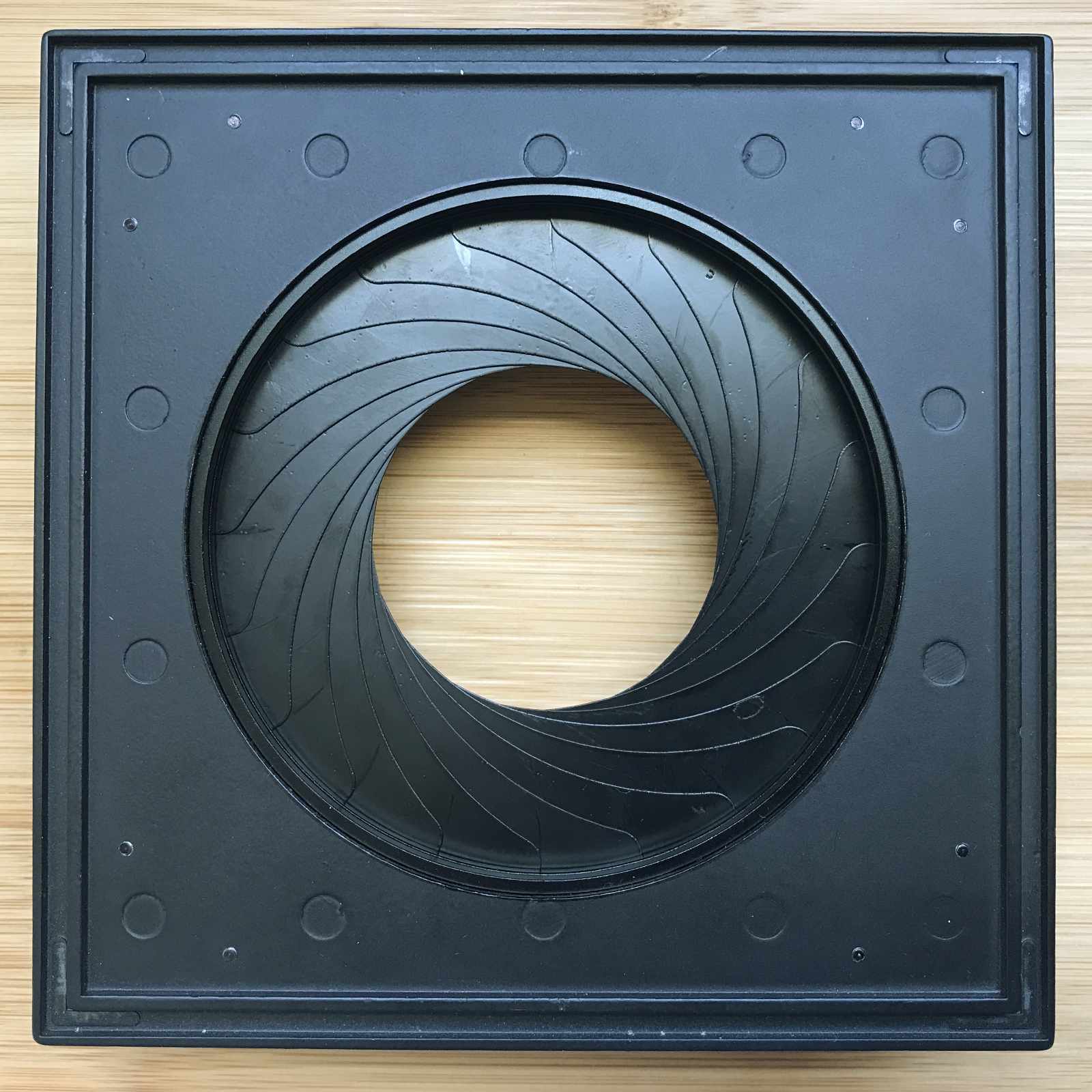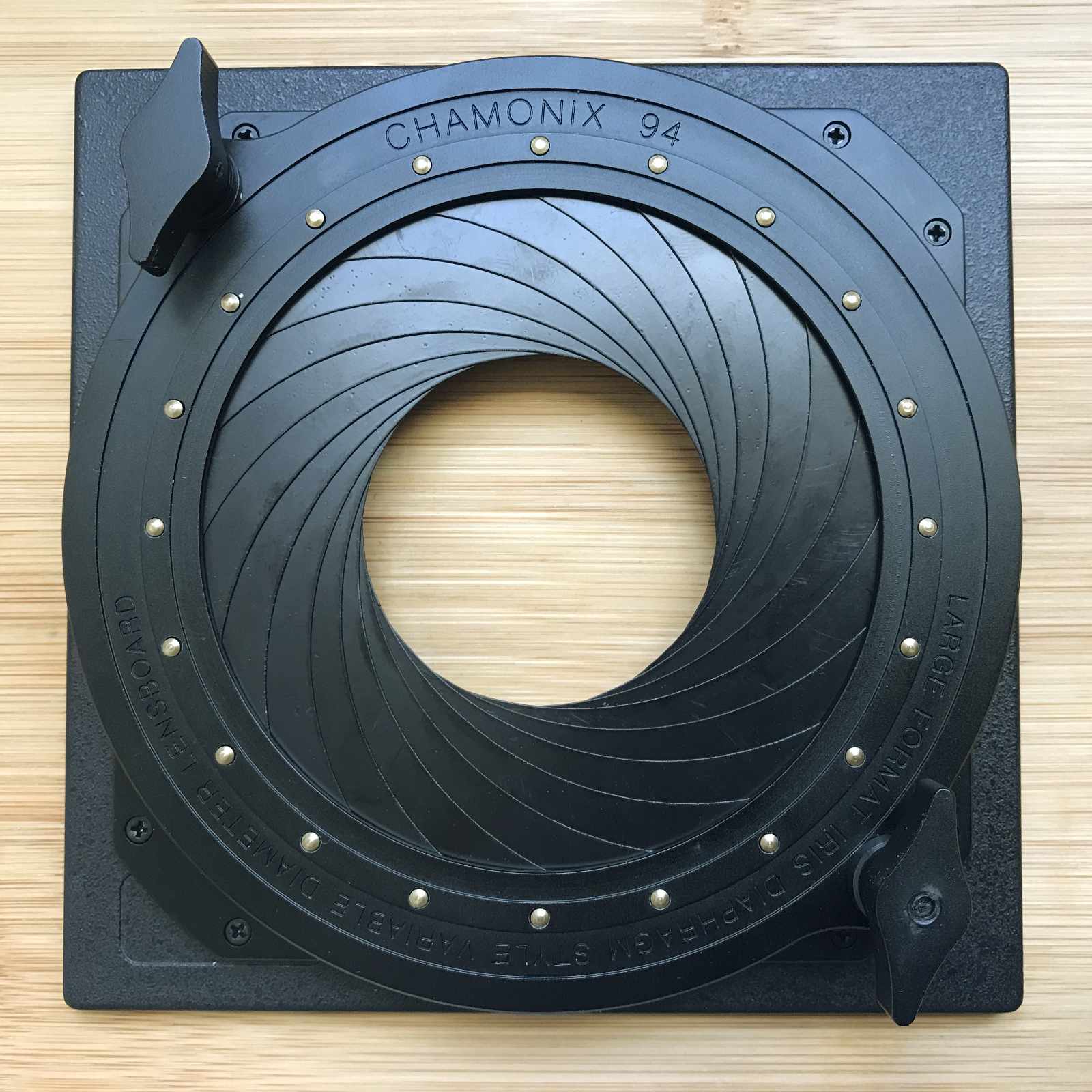 As promised, here a couple photos of the lens diaphragm mounted on a Sinar board. I needed 7mm long screws which weren’t available so I made a little bushing so I could shorten the screws on my lathe.