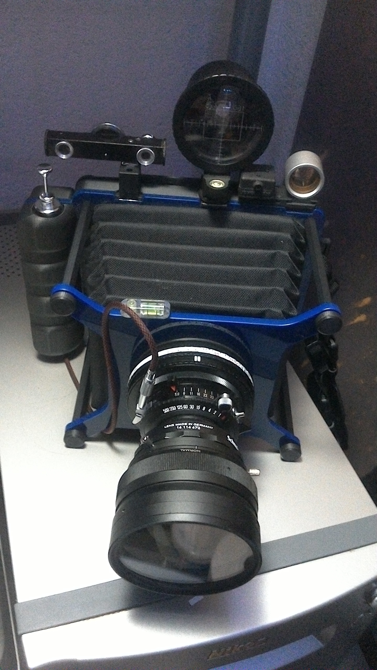 It's set up for 3 lenses: a 47mm f5.6 Super Angulon, a 90mm f6.8 Grandagon-N, and a 150mm f5.6 Symmar-S, which I plan to use with an 1.33x anamorphic adapter. I haven't had a lot of time to mess around with the anamorphic adapter, but from what I can tell so far is the focusing is tricky, but possible.