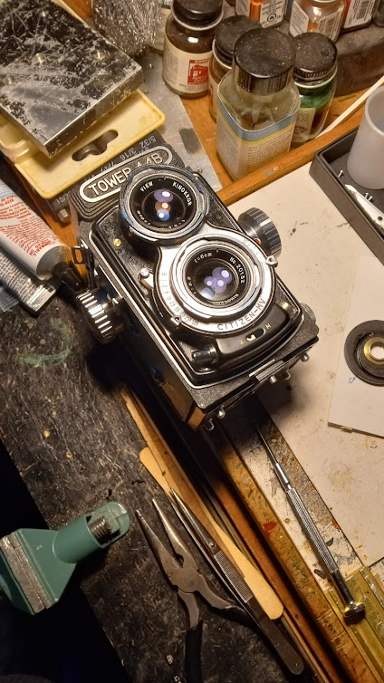 A couple of Tougodo 44’s. Both parts cameras, now merged into a FrankensteinTower 44B. The frame and back are from a Tower camera, the entire optical block (lenses, shutter, carrier plate and front) from a banged-up Kino 44 (another re-brand of the Tougodo). Still fiddling with the closure mechanism on the back. Focus is pretty sharp, though I’m going to put it on the collimator just to be sure.