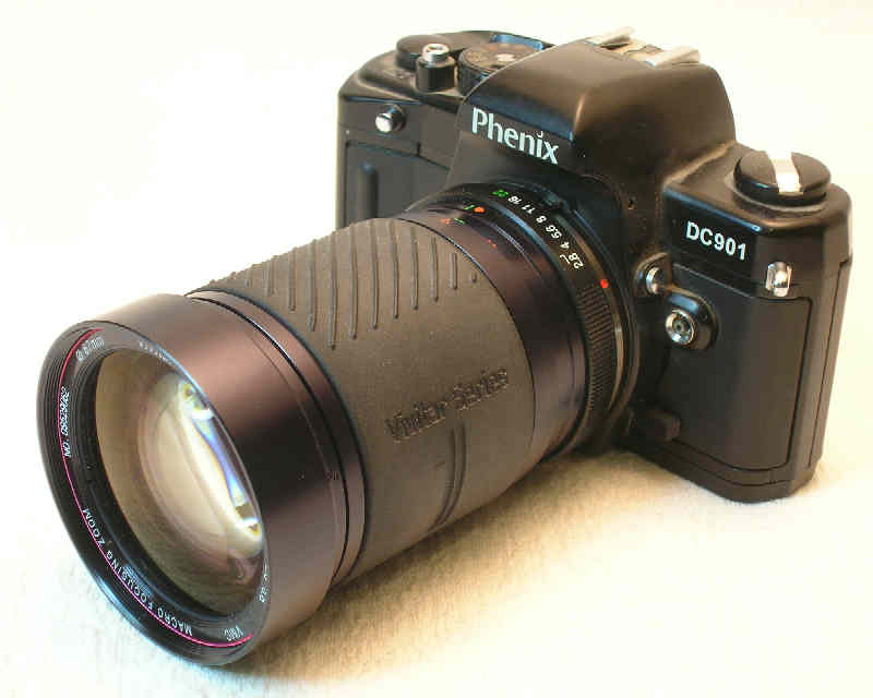 A hard-to-find Phenix DC901 -- with a Phenix 28-70mm f3.4-4.8 (!!!), two-touch, macro zoom lens. First, it has an all metal, vertical shutter that does not need a battery. Speeds from 1s to 1/2,000!!!. TTL LED metering in the viewfinder. Multi-exposure operation, DOF button, PC connection, hot shoe, self-timer, 45-degree, split-image focusing with micro-prism collar, tripod socket, cable release connection......