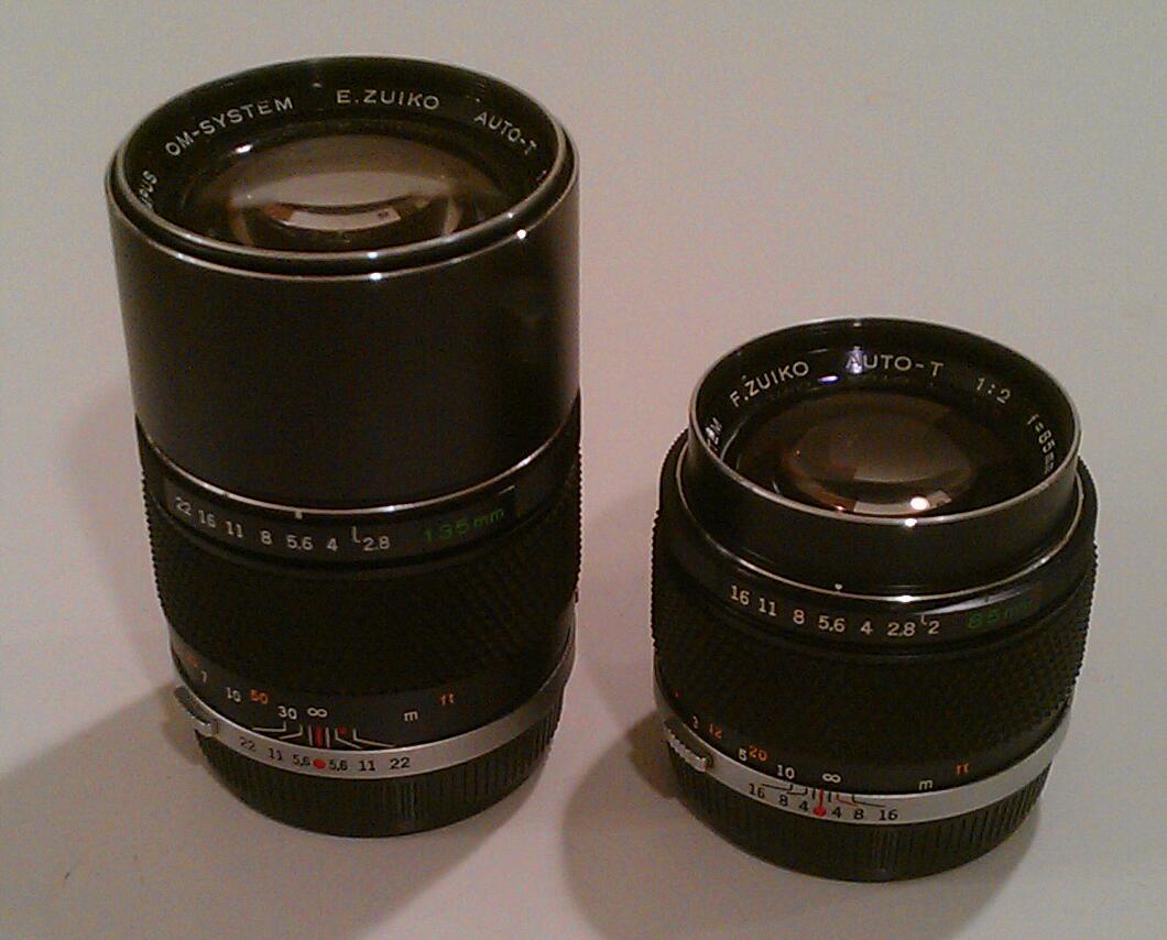 Two more lenses for my OM2n: the 135/2.8 (with built-in extendable hood) and 85/2:
