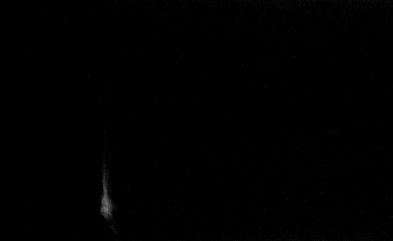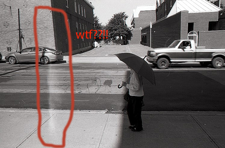 Here's the skinny: It shows up on about 50% of the shots. This is one of the worst, others are faint and I can burn/spot them in while printing so they're salvageable for the most part. I developed these with 13 other rolls of film at the same time and it ONLY showed up on the two rolls of FP4 125 film that I load in my Leica M4-P. So, I suspect camera. I have a sync plug busted out that I taped up and tape is slowly peeling, but this "leak" isn't hitting the edge of the frame -it's only inside the picture. This leads me to believe it's a sticky/erratic shutter movement or bounce, but it's not a super clean line. I looked at the curtains and they seem alright, but I think there was some patching going on at some point or something spilled around the spot where this is showing up. But since it happens for about 8 frames in a row, then skips 8, then another 4, then clean for 6, I don't think it's the curtains.