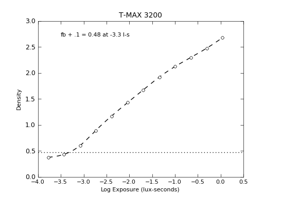 I've attached a plot and the code I used. I snatched some data from the Kodak pdf on T-Max 3200, one of the curves for T-Max dev I think in a small tank, the 13 min development time. I sampled 12 points off that curve to use as my starting point. I then generated a spline, an array of x values to fill in the blanks, and evaluated the spline at those values. The original data is plotted in white circles, the spline fit is the dashed line. I then figured out what fb+.1 was by searching for the minimum y value of the spline + .1. fb + .1 is printed at the top, and is also shown in the dotted horizontal line.