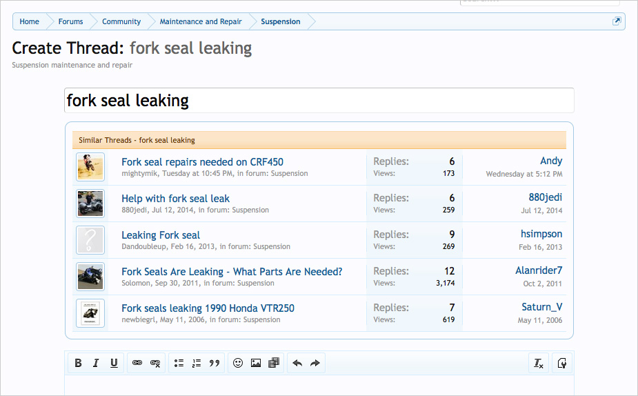 There is a addon for "similar threads" that when creating a new thread will auto list similar threads. Would people find this useful or annoying? It could stop a lot of repeats but some may still fall through the cracks. This is what it looks like: