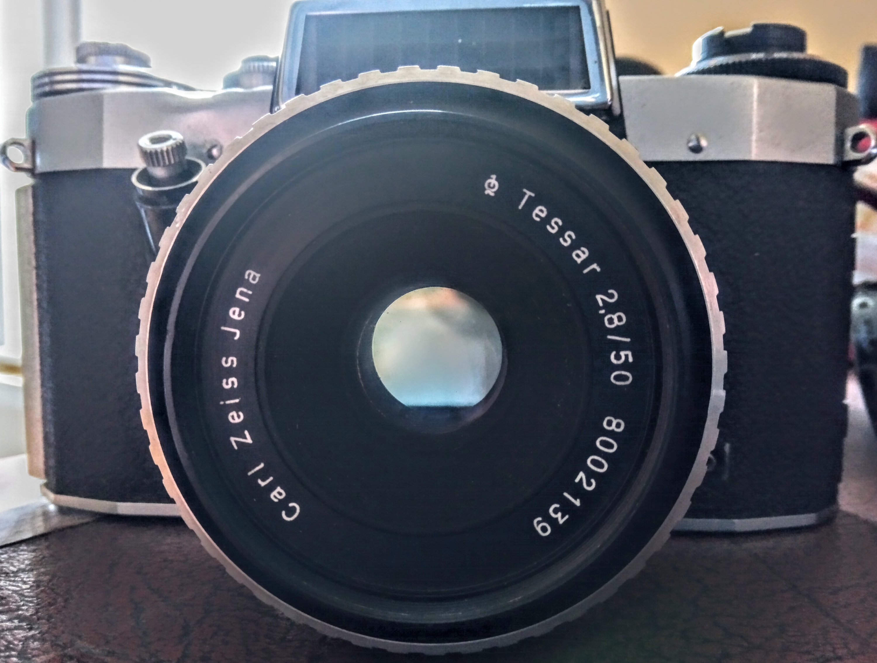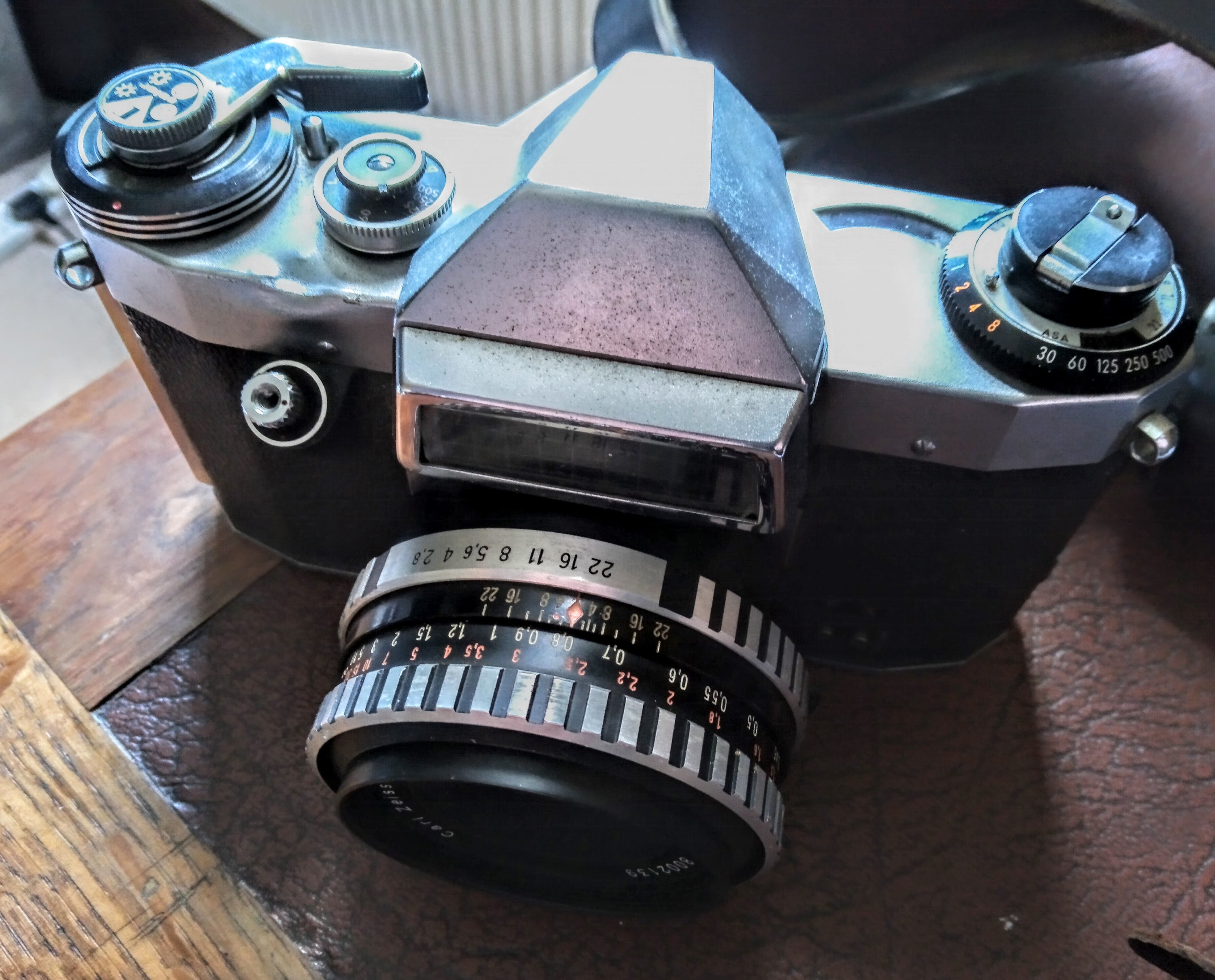 Here's little puzzle. I've been going through a bag of old cameras my grandpa had that have been passed on to me as the family nerd. Some interesting if mostly knackered old cameras, but here's a working one with no maker's mark. The case it was in says 'Made in Germany' on it, and the lens fit is M42, but apart from that, no clue. Any detectives here?