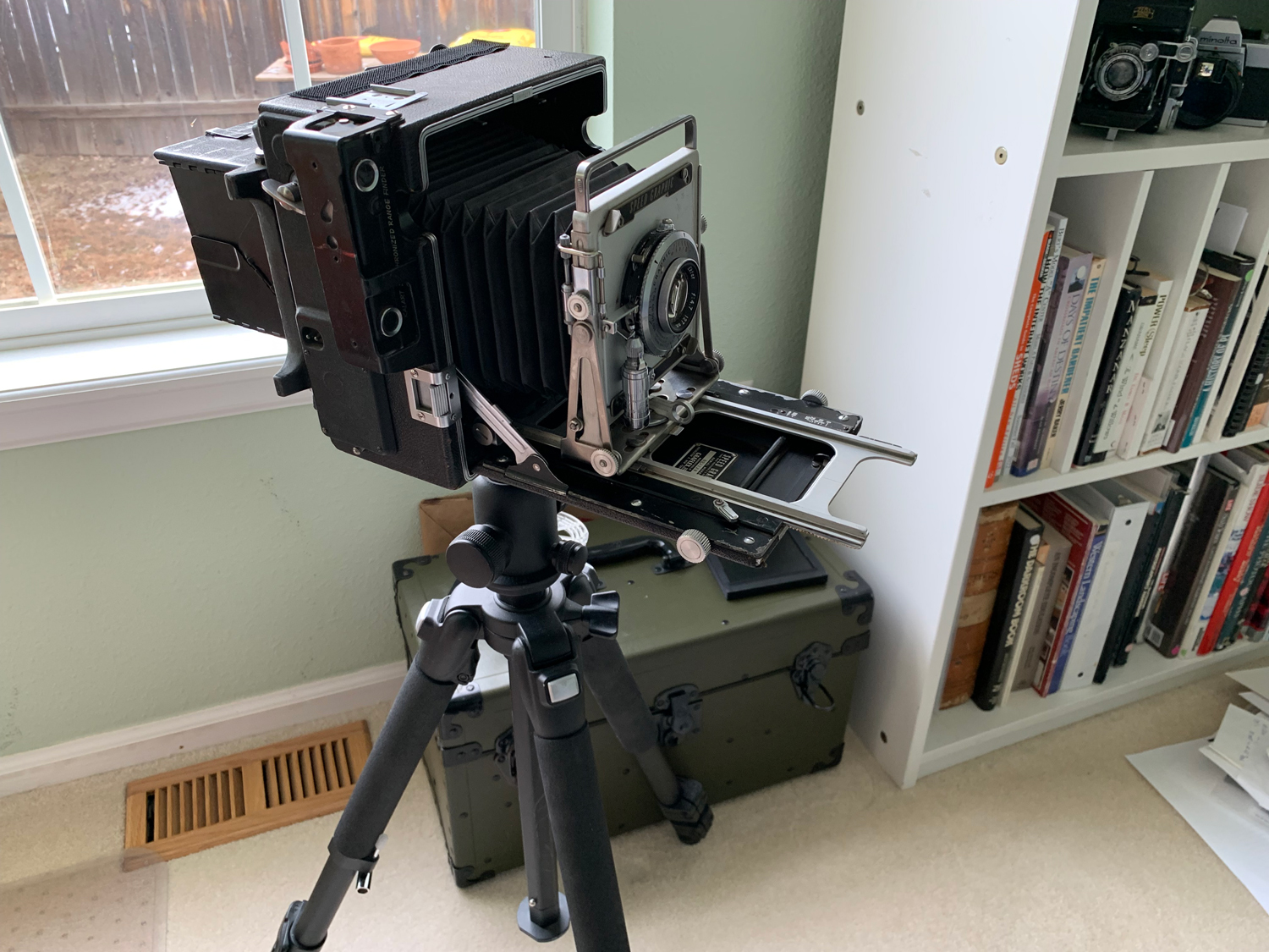 Almost exactly 2 years after I decided finally to give up on large format forever and ever, amen. A Pacemaker Speed Graphic with a Graphic 127mm lens, unmolested light saber, and restored original trunk. It's in a lot better shape than I expected. The Kalart rangefinder and the curtain shutters appear to work, but the seller had never used them. I doubt I'll have occasion to either. After downloading the manual and fiddling with it for a week, it feels nice and comfortable to use. It should be plenty handy for setting up away from the car.