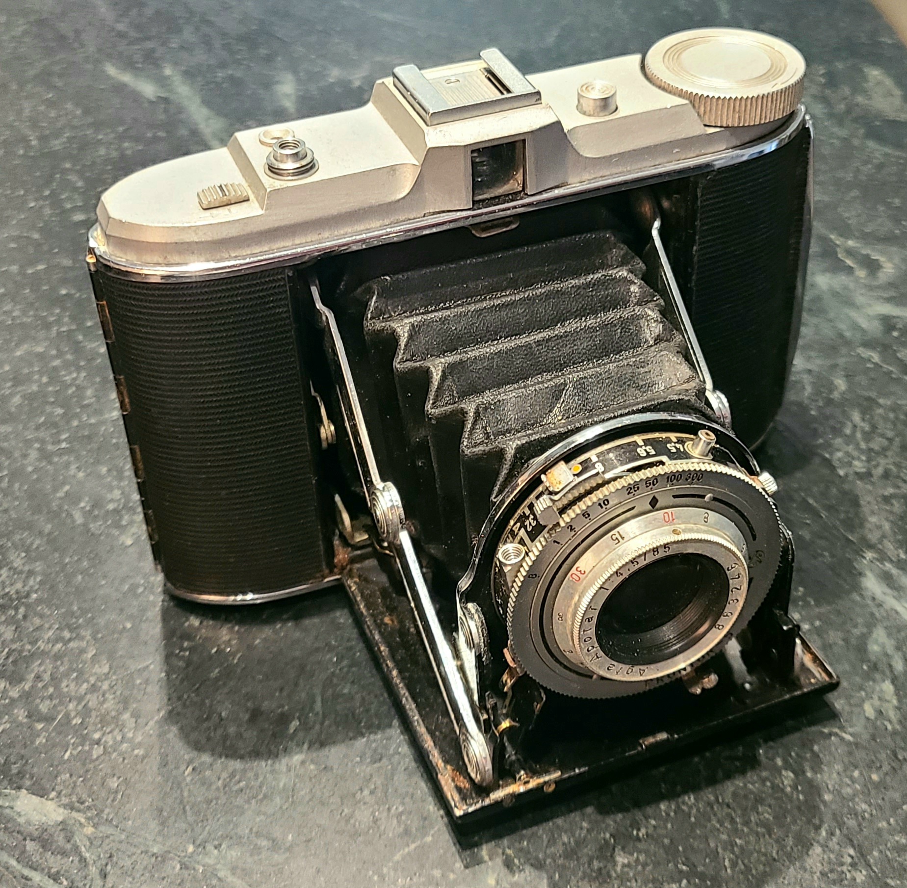 This arrived about an hour ago. It's an early 1950's vintage Agfa Jsolette. It has the typical frozen focus ring but the bellows look to be in decent shape. The camera is rough otherwise though and the shutter mechanism does not work. The remote linkage is jammed and corroded. I'll have the lens front section soaking in alcohol shortly and will work on figuring out if the shutter mechanism can be restored.