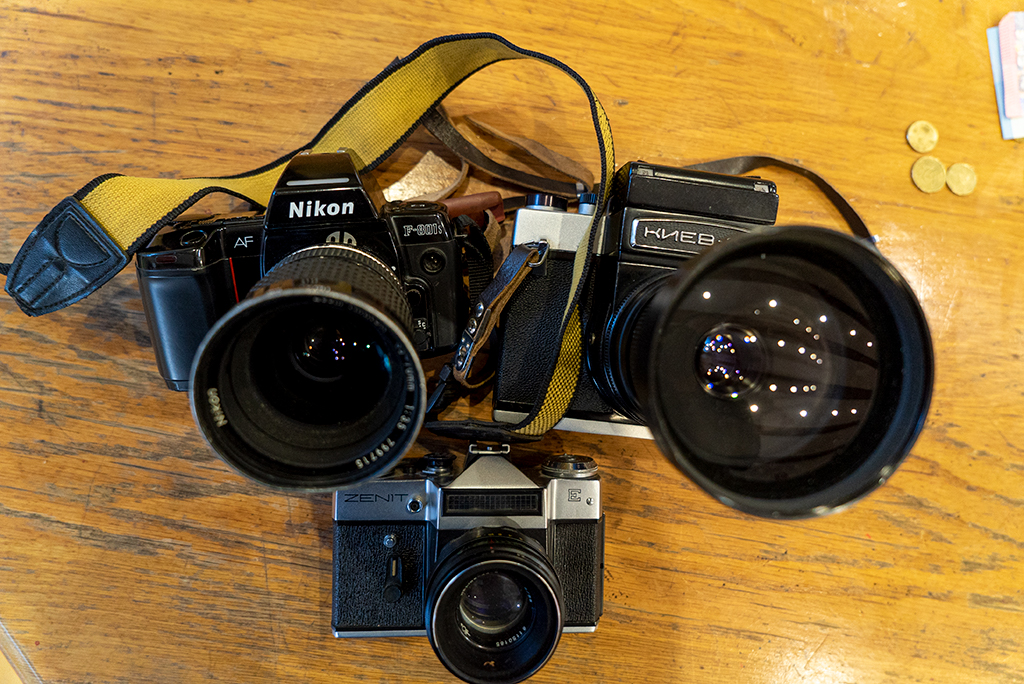 A friend wanted to get rid of his cameras so he gave me these 3, a Nikon F-801S (N8008s), a Kiev 6S (6C) and a Zenit E. I have enough to play with for a while. It is great I own a 180mm 2.8 Sonnar with a p6 mount so it should be compatible with the Kiev 😀