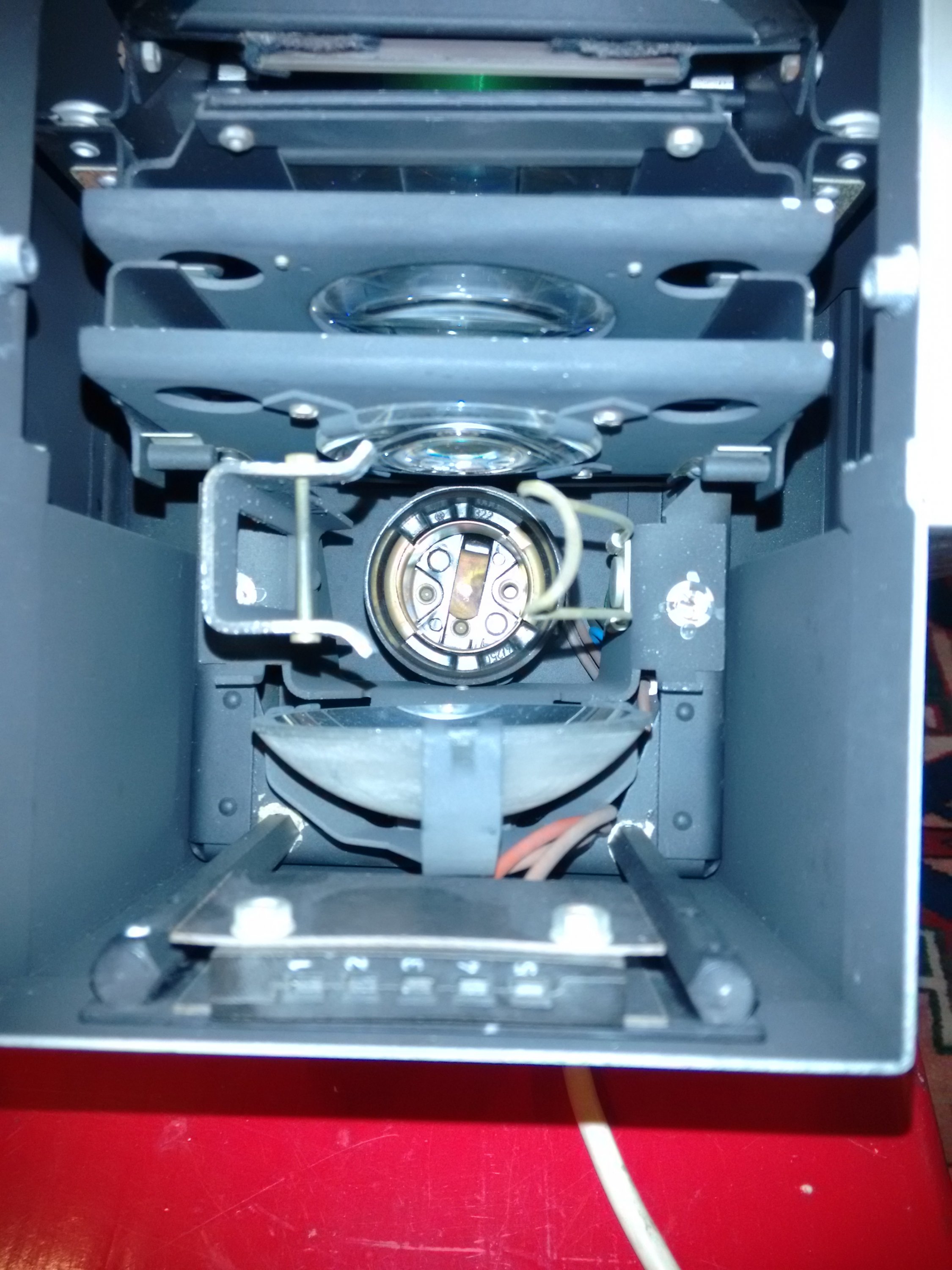 That is a condenser enlarger. It will be difficult to get a dichroic halogen lamp with the same focal length mirror. If I had that I'd get into the 'vintage lamp' market and get a few lamps for its existing socket.But with the voltage issue in mind you may better exchange the socket for a GX 6.35 socket and use a current high power single-side pinned halogen bulb for 230V instead.