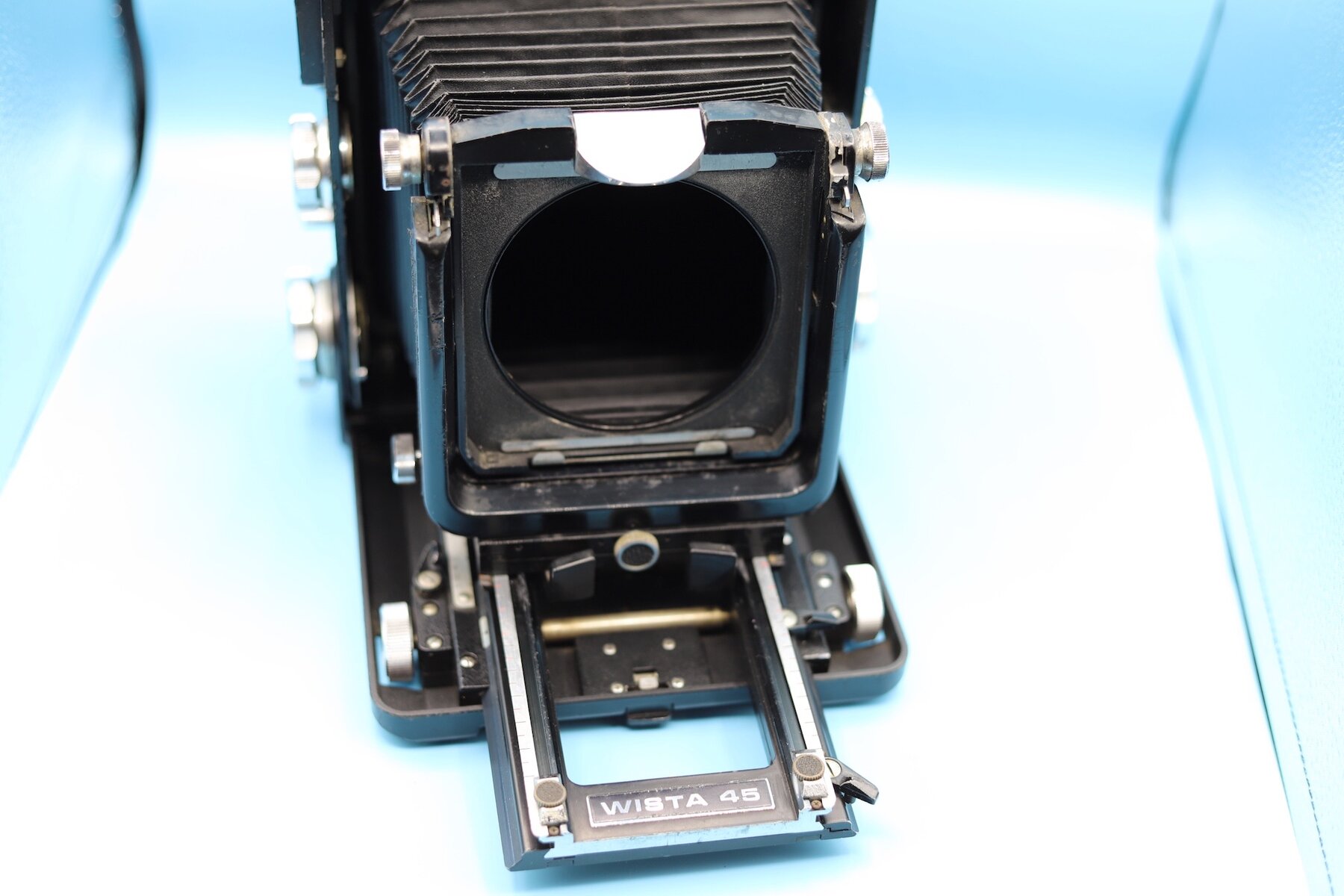 I waffled regarding this sale for a while and have decided to let it go. The camera functions properly in all aspects but is not "mint." it shows signs of use and is missing its Wista badge from the front/base plate. The bellows is light tight.