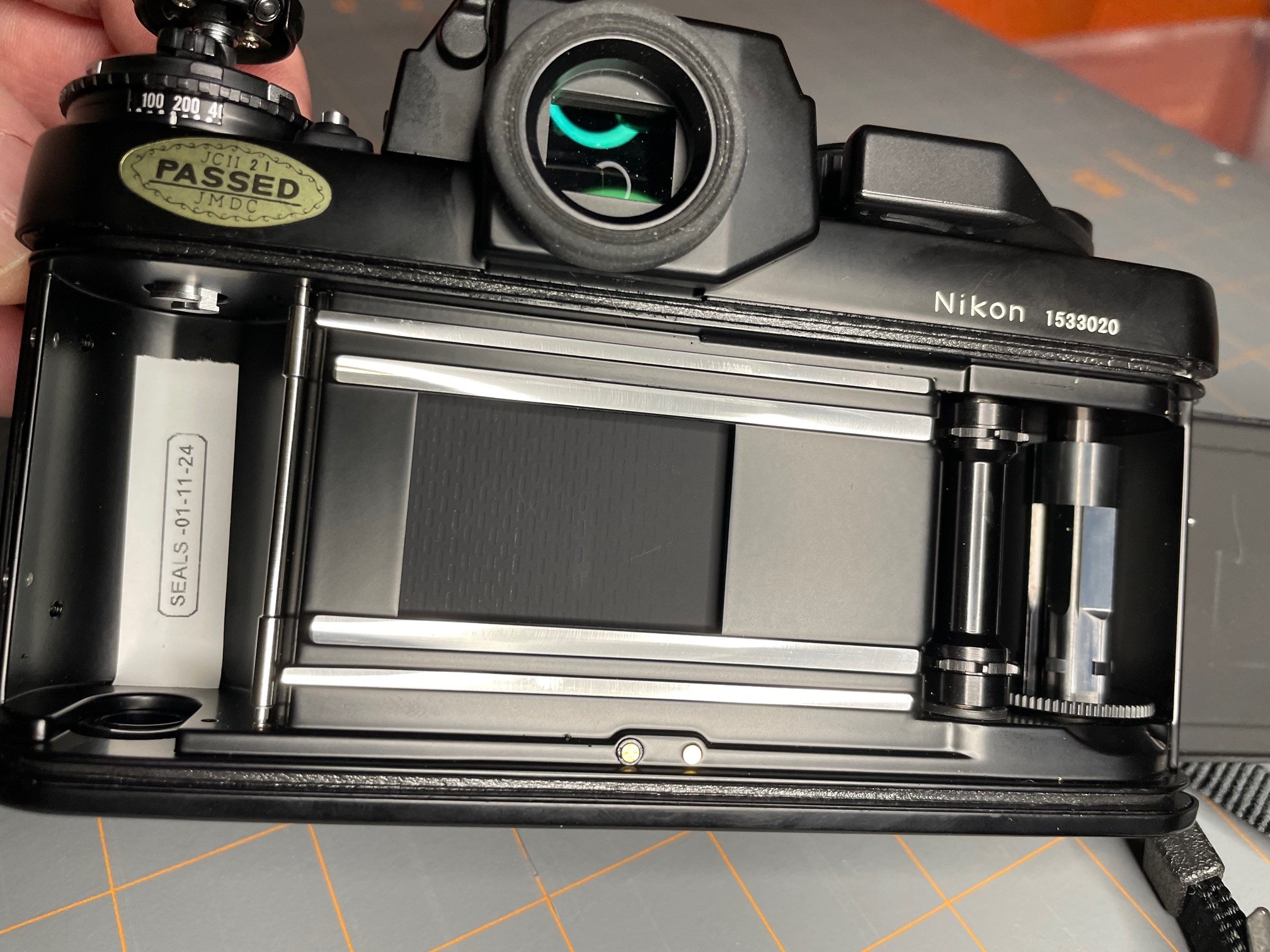 Look carefully at the photos, as this camera has a brand new set of light seals from Jon Goodman; all seals in the back and in the viewfinder have been replaced.