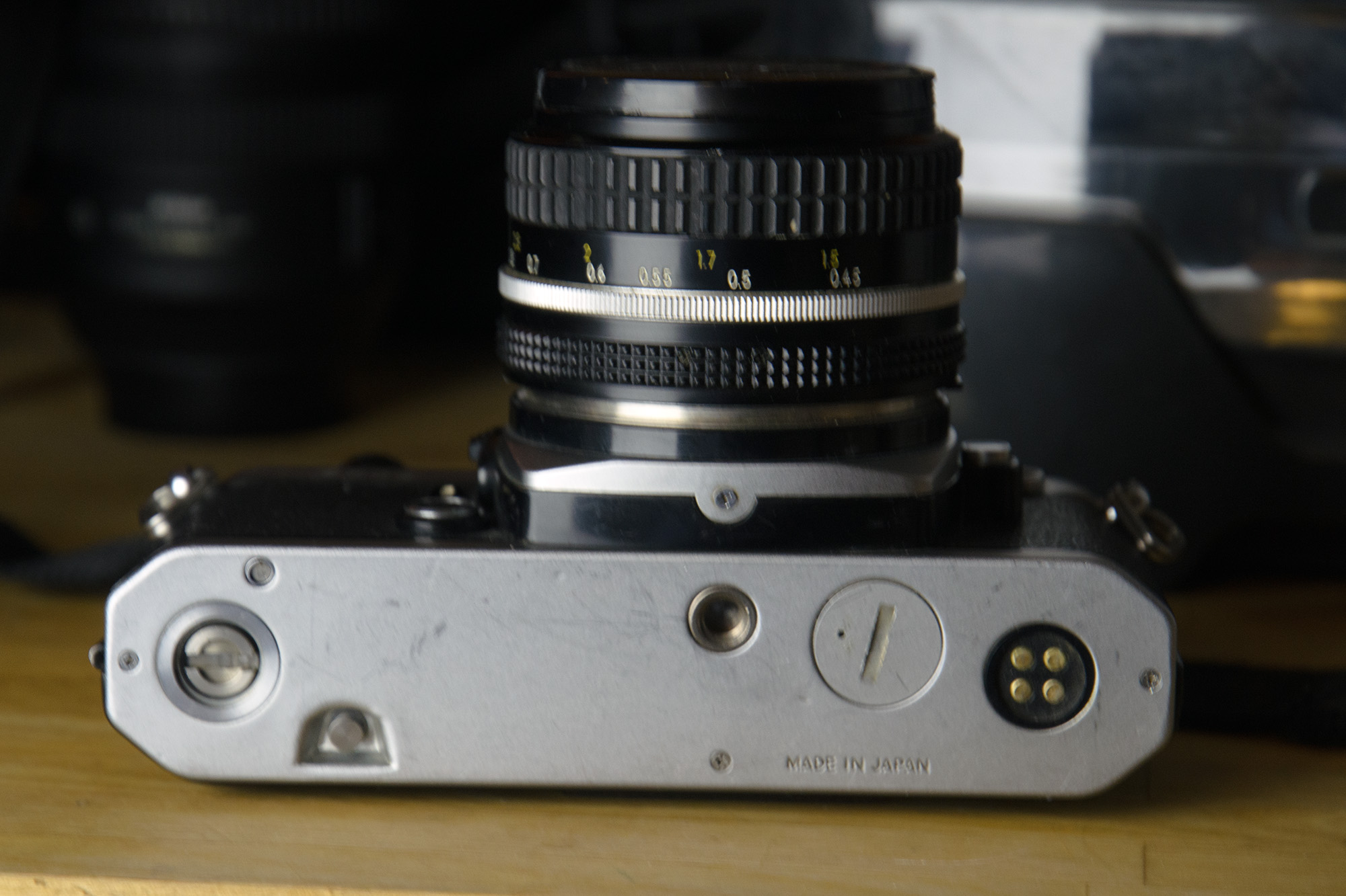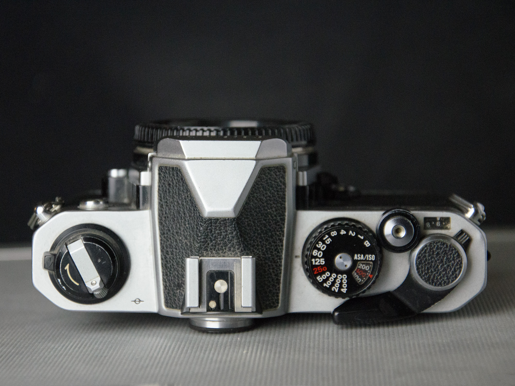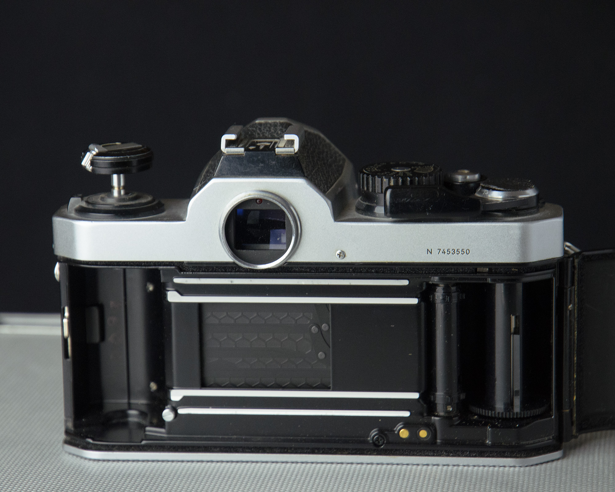 Classic Nikon film camera body. This is the "n" version with 1/250s flash sync speed and titanium honeycomb shutter. Serial number N 7453550. Excellent condition. All functions work. Shot film in it recently. See samples. Light seals are intact. The self-timer lever was missing when I bought this, so I replaced it with one from a Nikon FE, slightly different styling, but same functionally. Body covering fine, metal finish fine. No dents. Viewfinder clean. Light metering fine. Will be supplied with body cap and a worn rubber eyepiece ring.