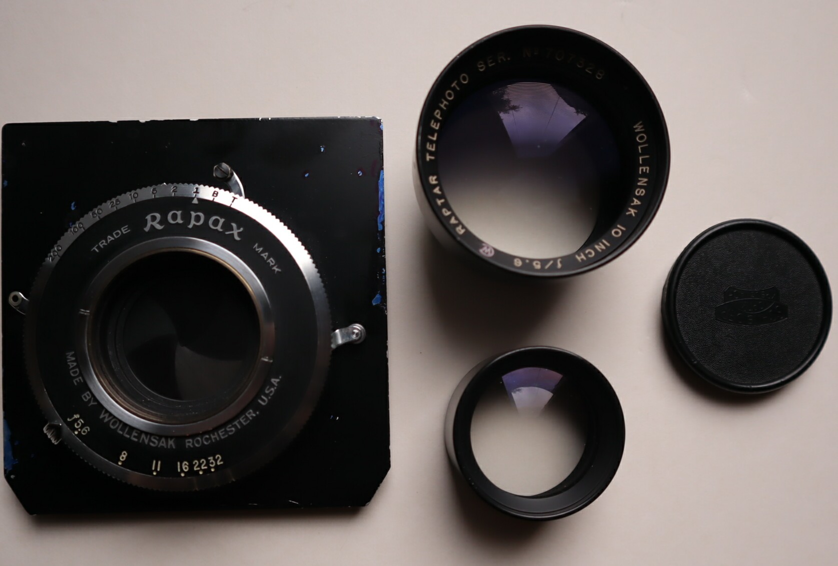 Wollensak 10-inch telephoto F 5.6 with perfect front and rear elements, no flaws whatsoever, and a shutter that works in all settings and is accurate to the ear.